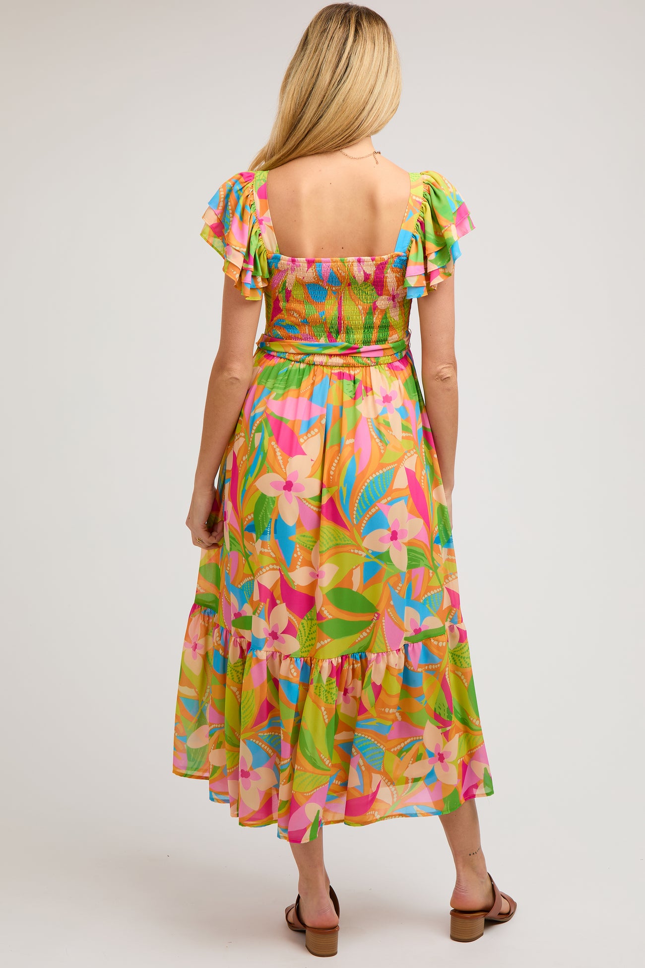 Orange Floral Print Flounce Sleeve Maternity Midi Dress