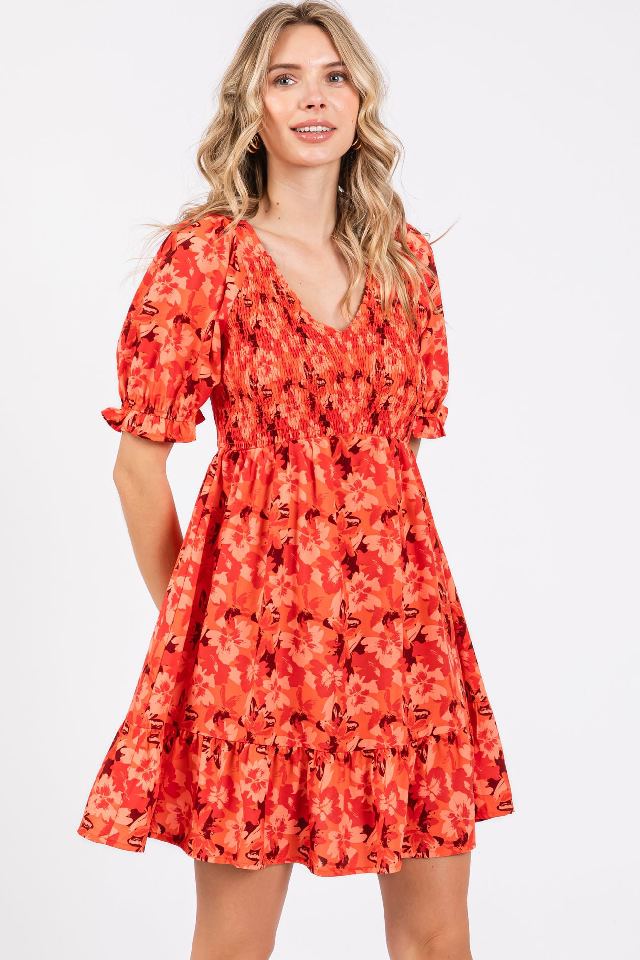 Orange Floral Smocked V-Neck Ruffle Maternity Dress