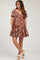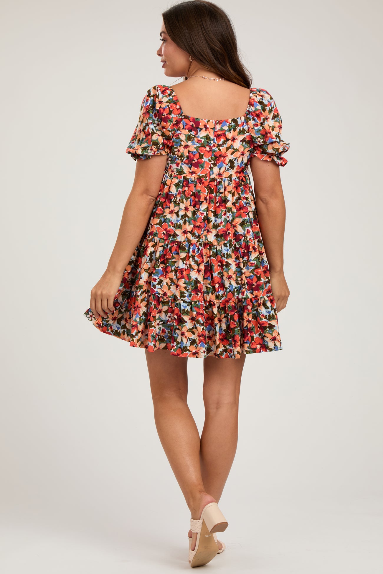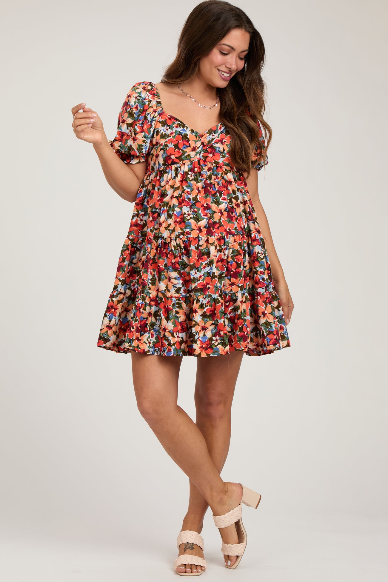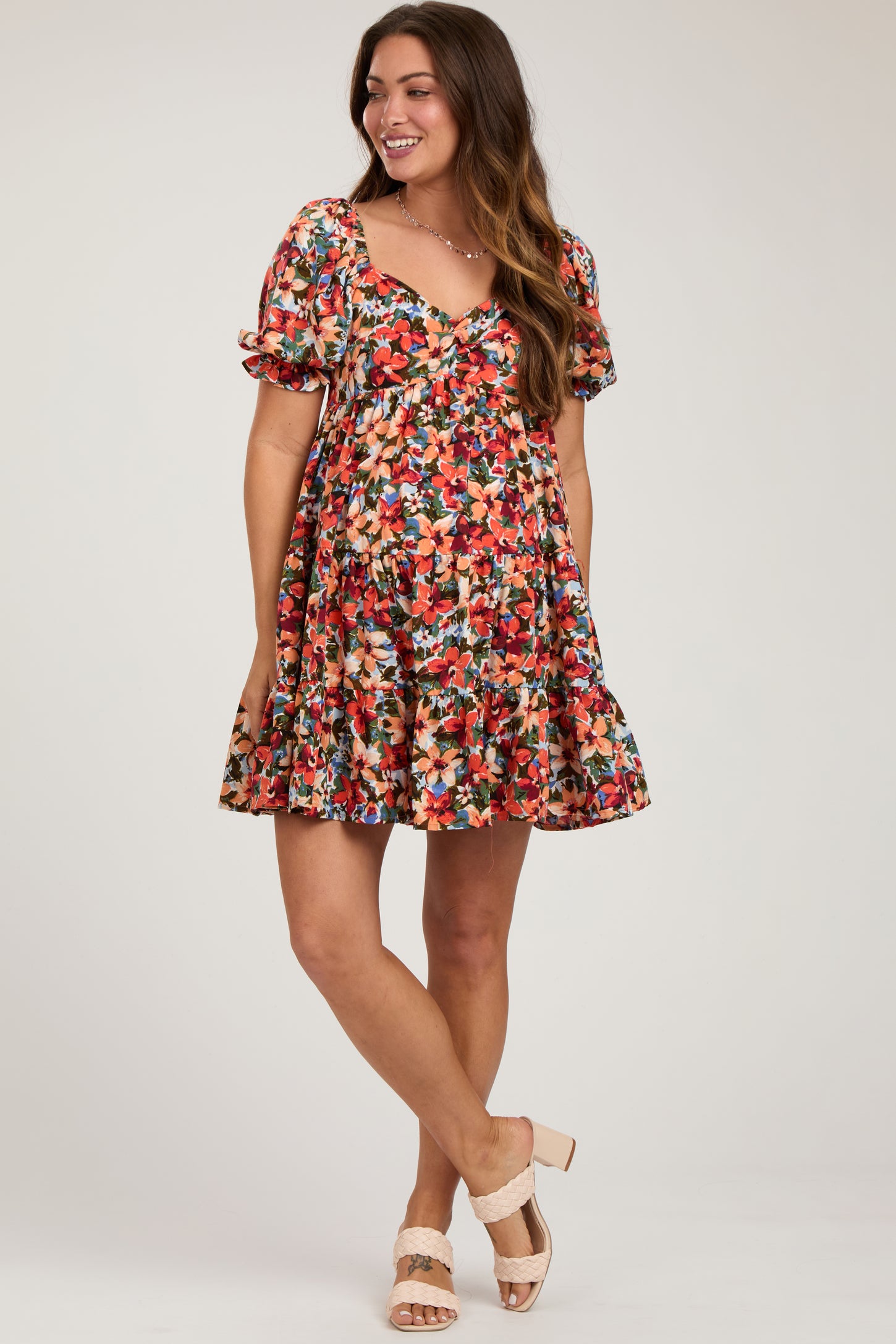 A multi-color floral maternity dress featuring short puff sleeves, a tiered body, a ruffle hem, a sweetheart neckline and a back zipper closure.