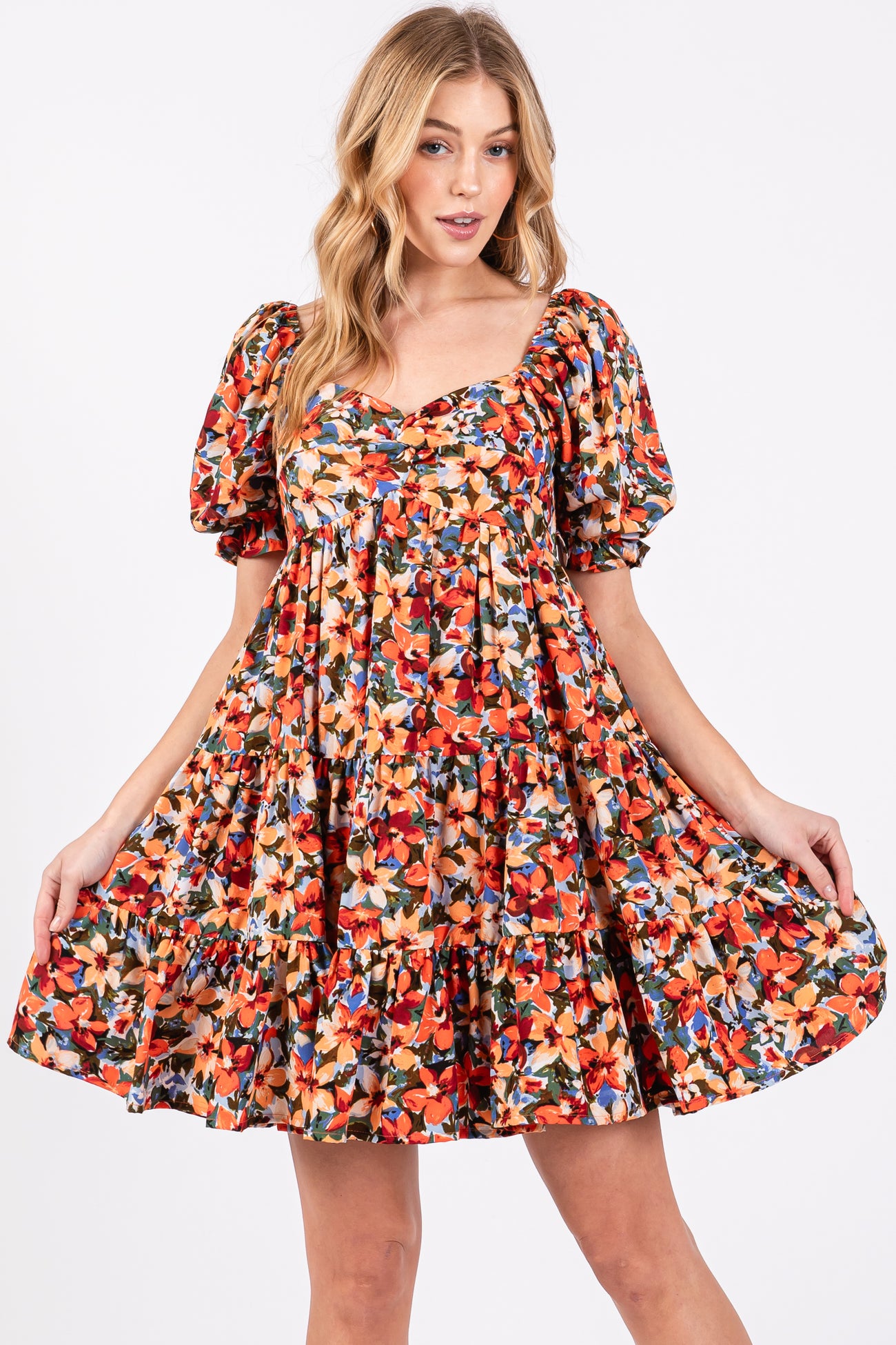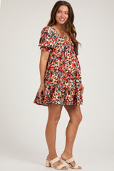 Orange Multi-Color Floral Puff Sleeve Ruffle Hem Maternity Dress