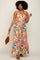 A multi-colored palm printed maxi dress featuring a square neckline, adjustable tie straps, a smocked elastic back and a ruffle hem.