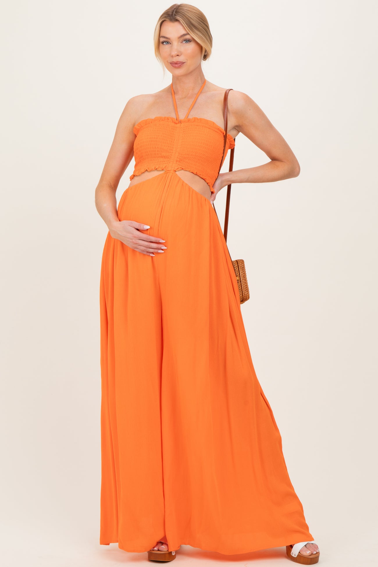 Orange Smocked Drawstring Halter Side Cutout Maternity Jumpsuit