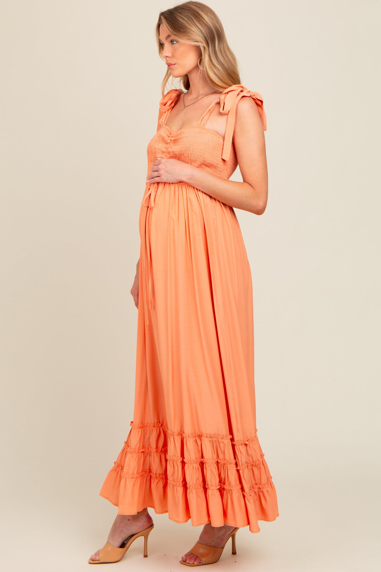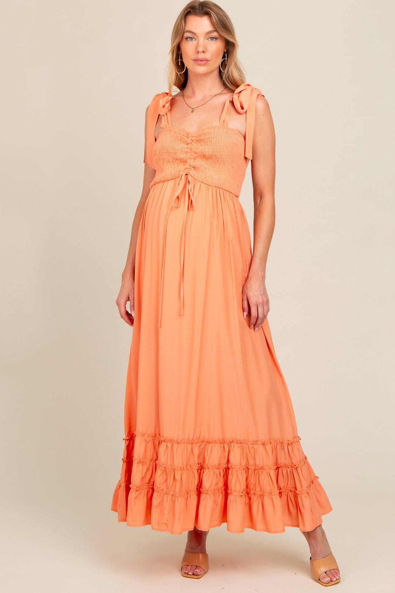 Orange Sweetheart Neck Smocked Shoulder Tie Maternity Maxi Dress