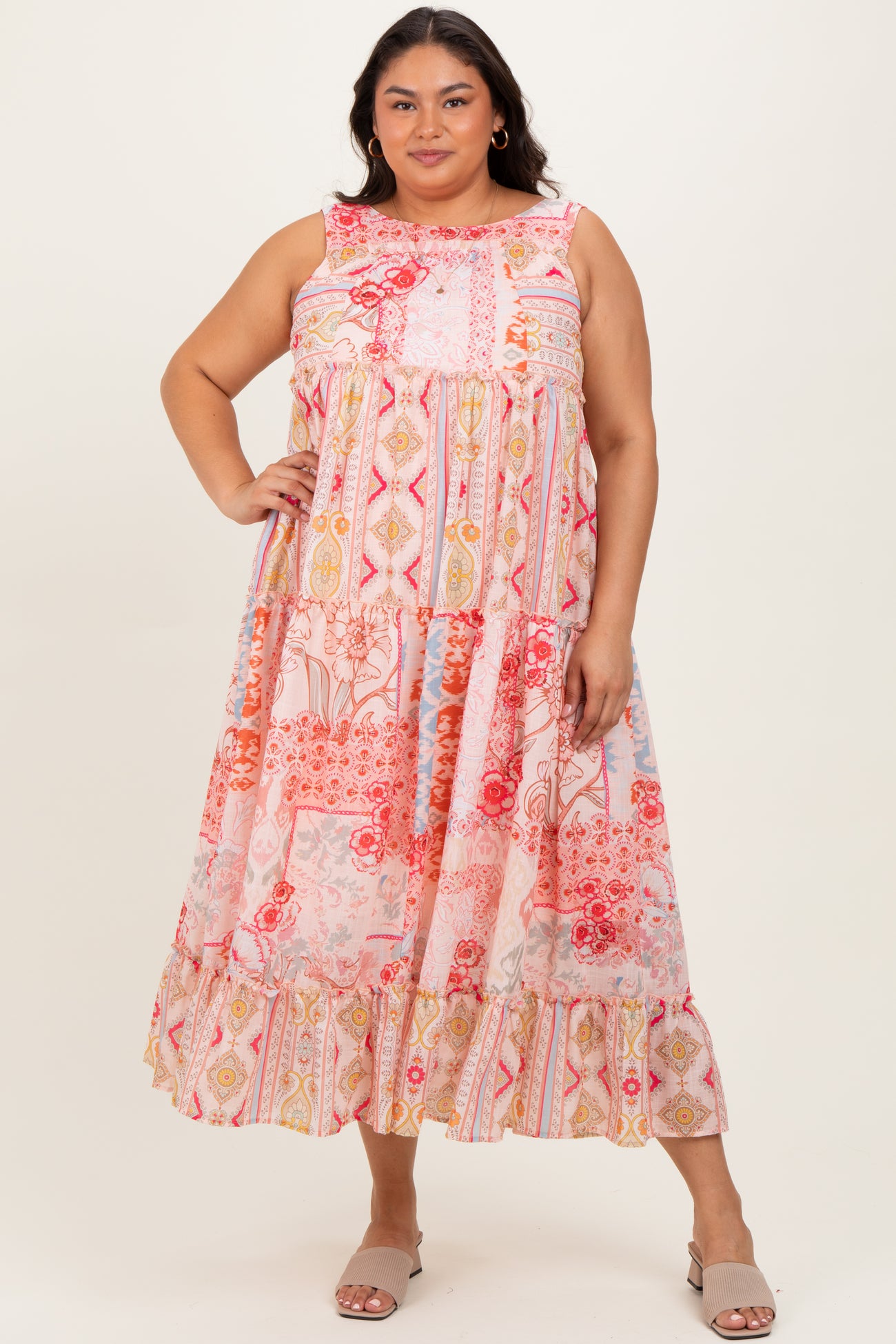 Step into effortless style with our Peach Abstract Printed Plus Maxi Dress. This flowy, sleeveless maxi features a beautiful patchwork-inspired print in soft peach, coral, and subtle hints of grey and yellow. Designed with a tiered skirt and delicate ruffle hem, it offers a flattering, breezy fit perfect for warm days or casual outings. Made from lightweight, breathable fabric, this dress combines comfort with eye-catching charm. Pair it with sandals for a laid-back look or dress it up with accessories for brunch or garden parties. Embrace vibrant prints and plus-size elegance with ease!