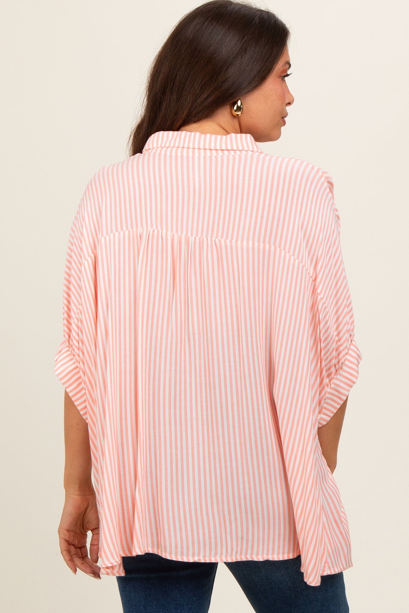 Embrace comfort and style with our Peach Striped Button Up Dolman Maternity Top. Featuring a soft peach and white vertical stripe pattern, this top offers a relaxed fit with dolman sleeves for easy movement and breathability. The lightweight fabric gently drapes over your bump, while the button-up front adds a classic touch and allows for adjustable coverage. Perfect for casual outings or layering, this maternity top pairs beautifully with jeans or leggings. Designed to keep you comfortable throughout every stage of pregnancy without sacrificing style. Machine washable for easy care. Your go-to top for effortless maternity chic!