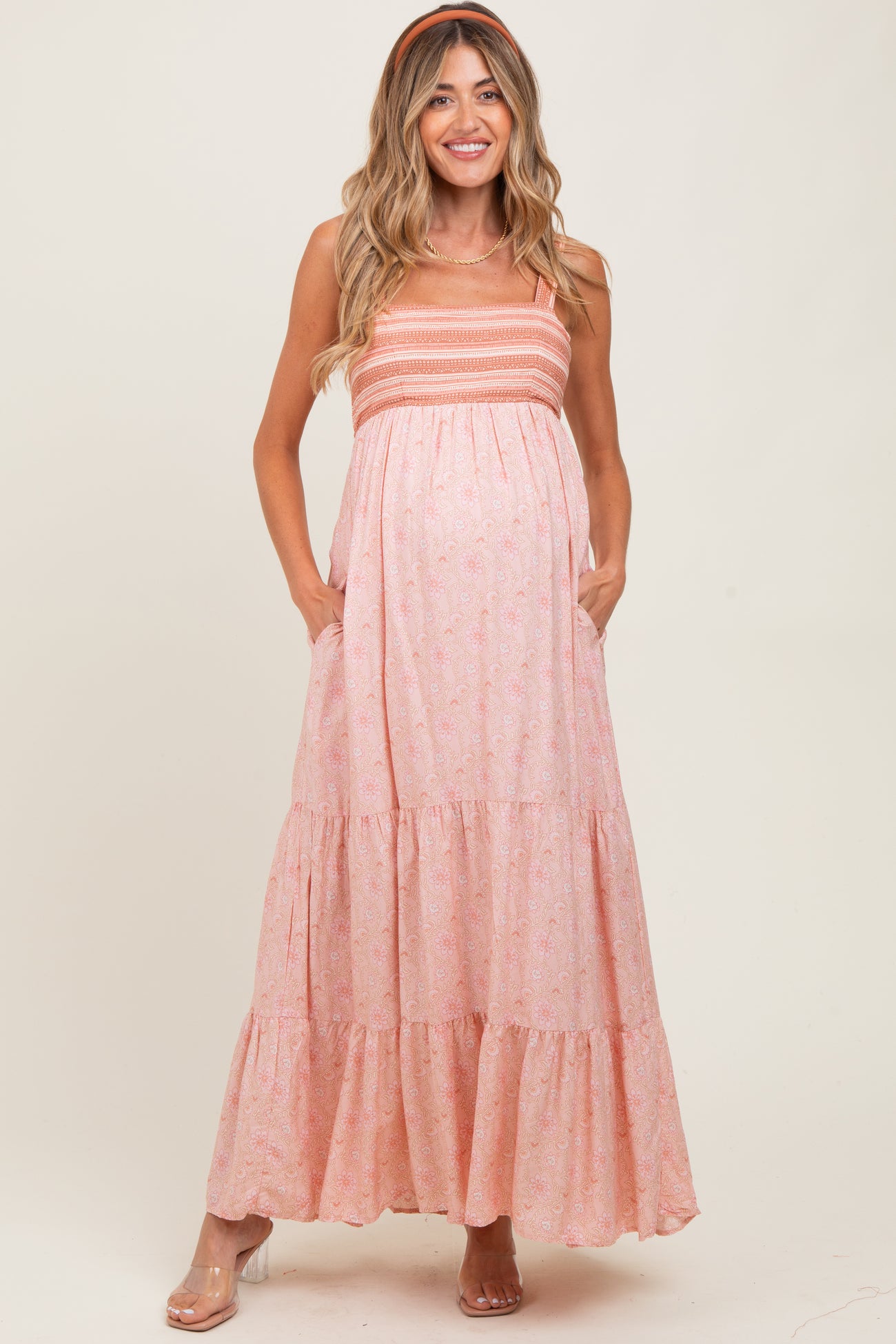 Pink Border Print Sleeveless Maternity Maxi Dress