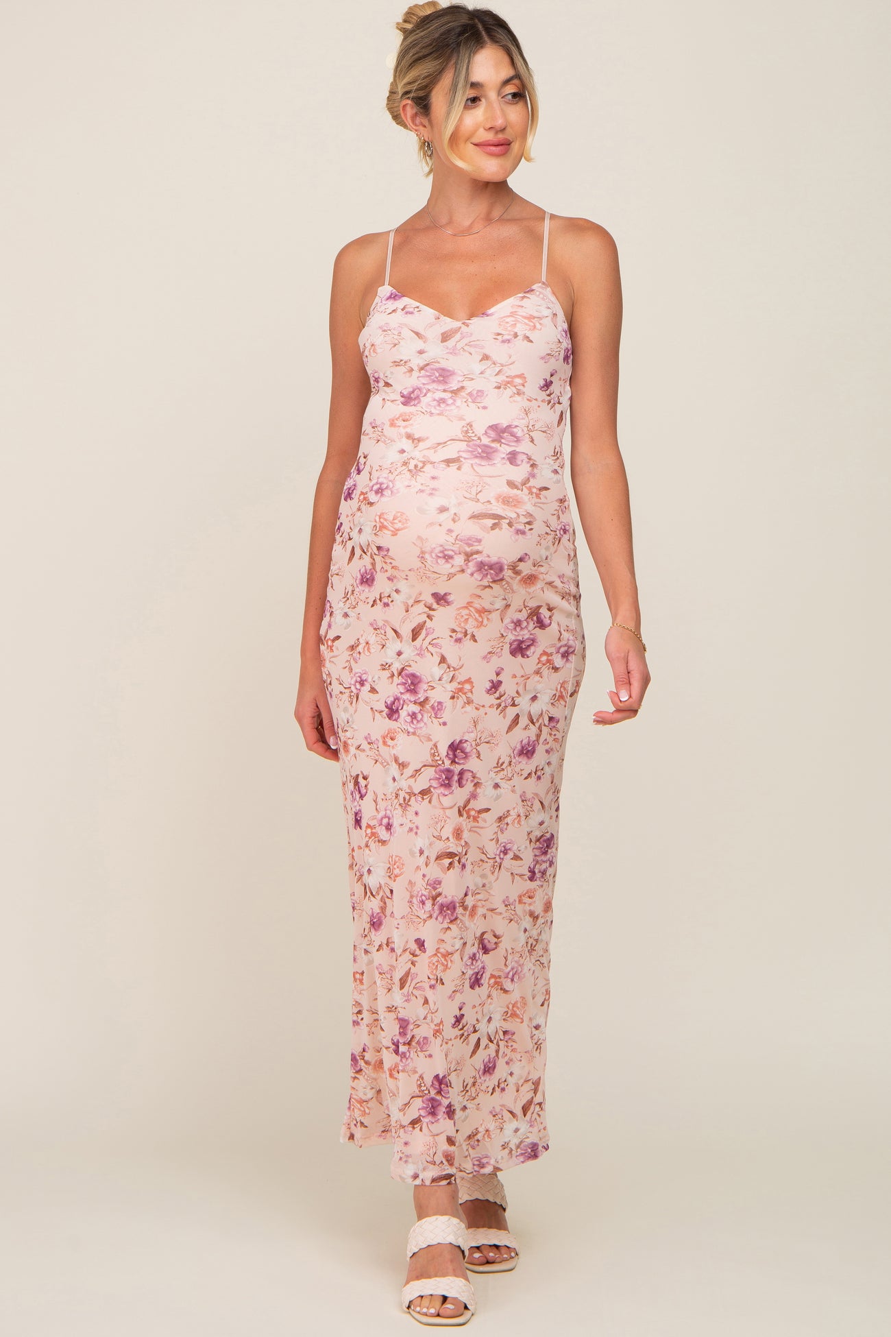 Pink Floral Mesh V-Neck Maternity Maxi Dress