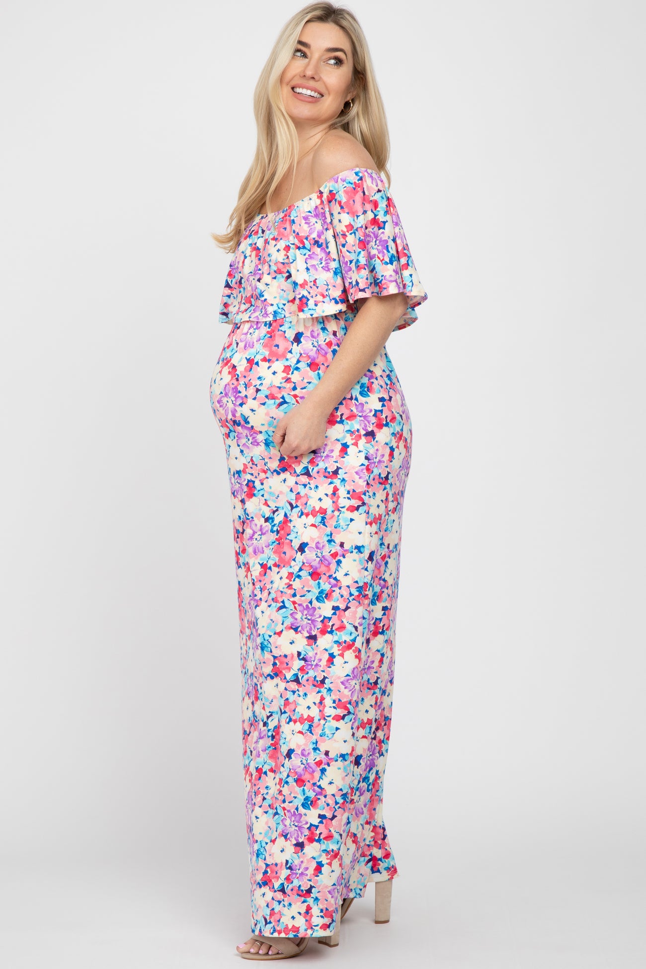 Pink Floral Off Shoulder Maternity Maxi Dress