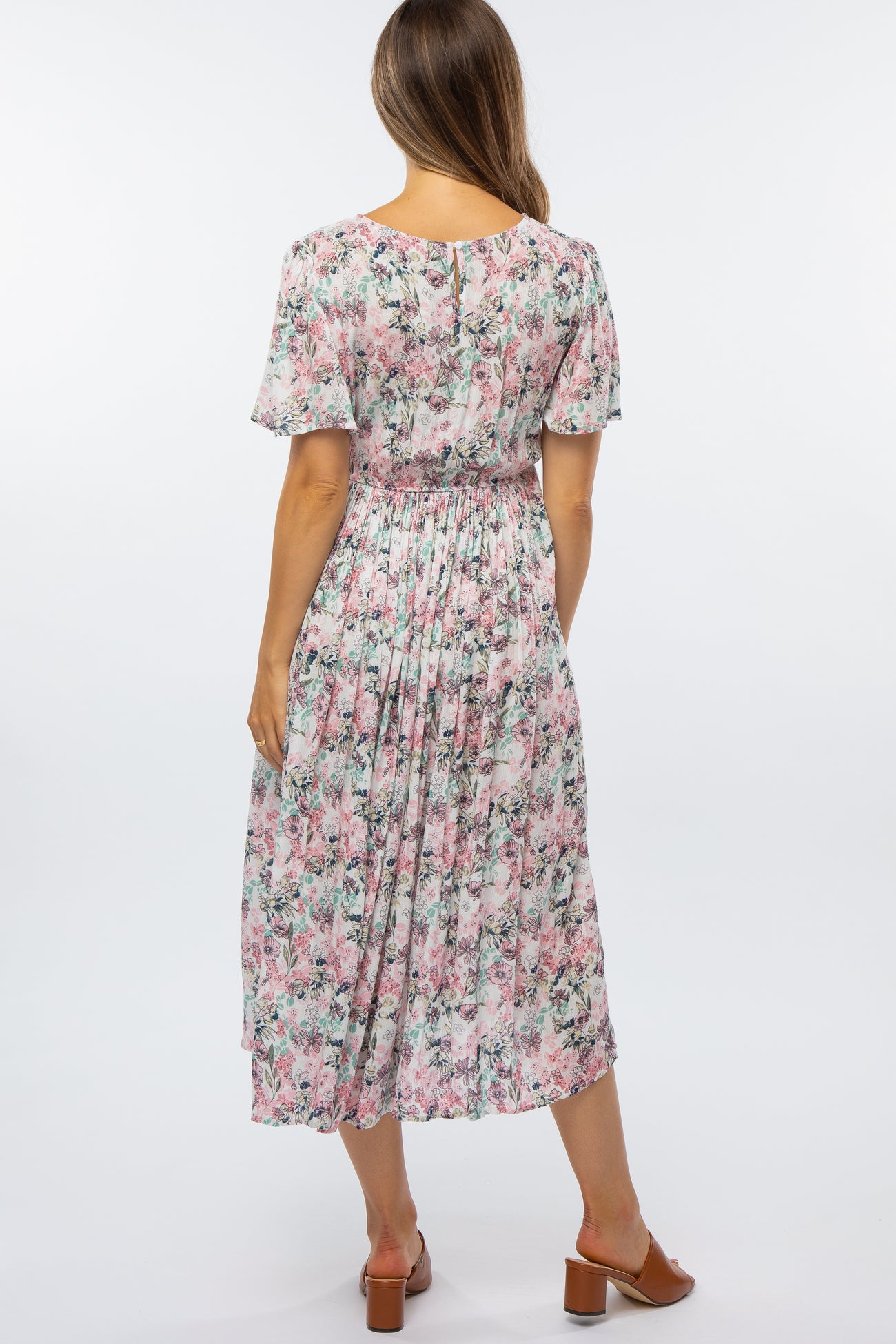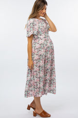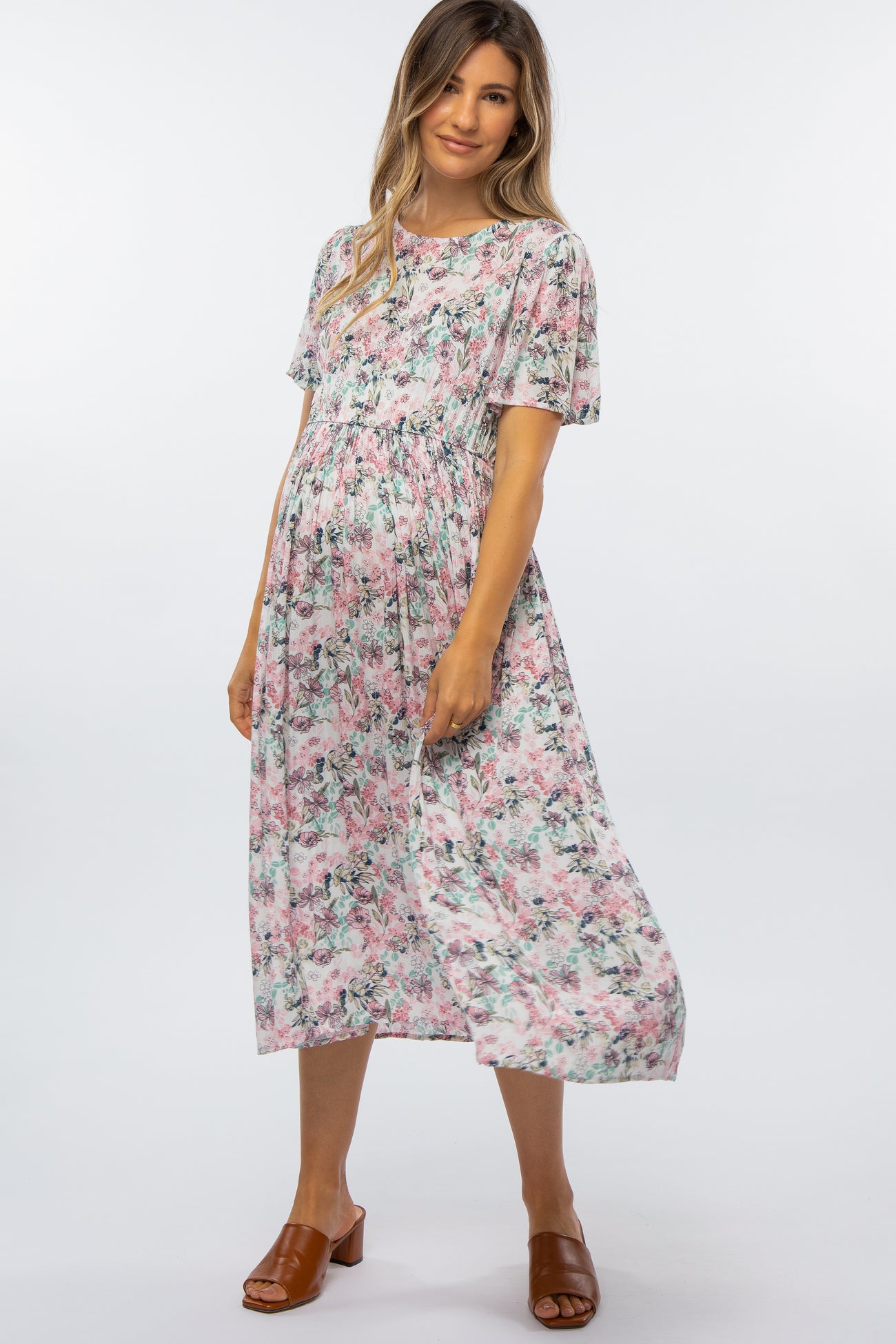 A floral print maternity midi dress. Features flutter sleeves and pleated skirt. Keyhole opening with button closure at back.