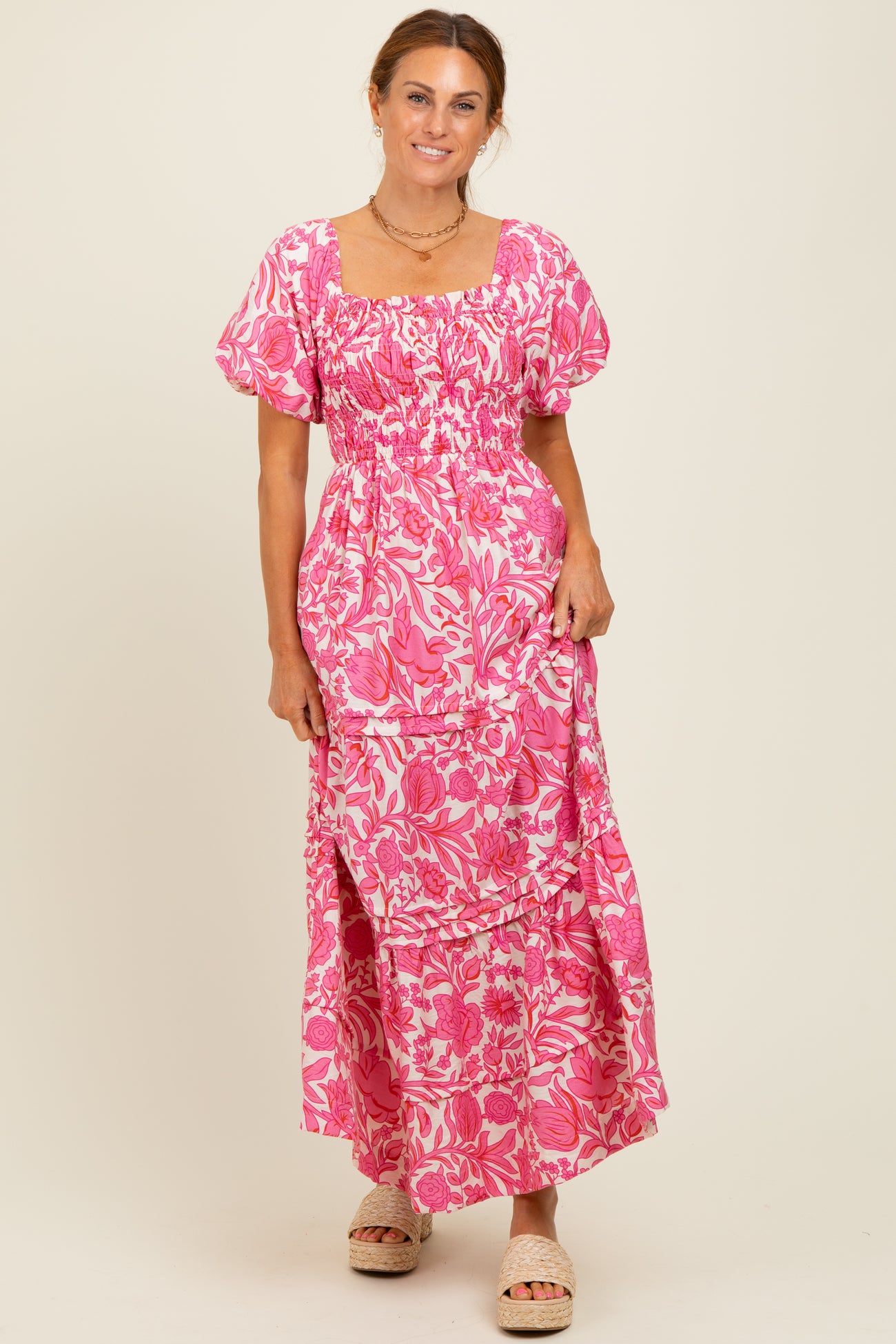 Pink Floral Smocked Puff Sleeve Maternity Maxi Dress