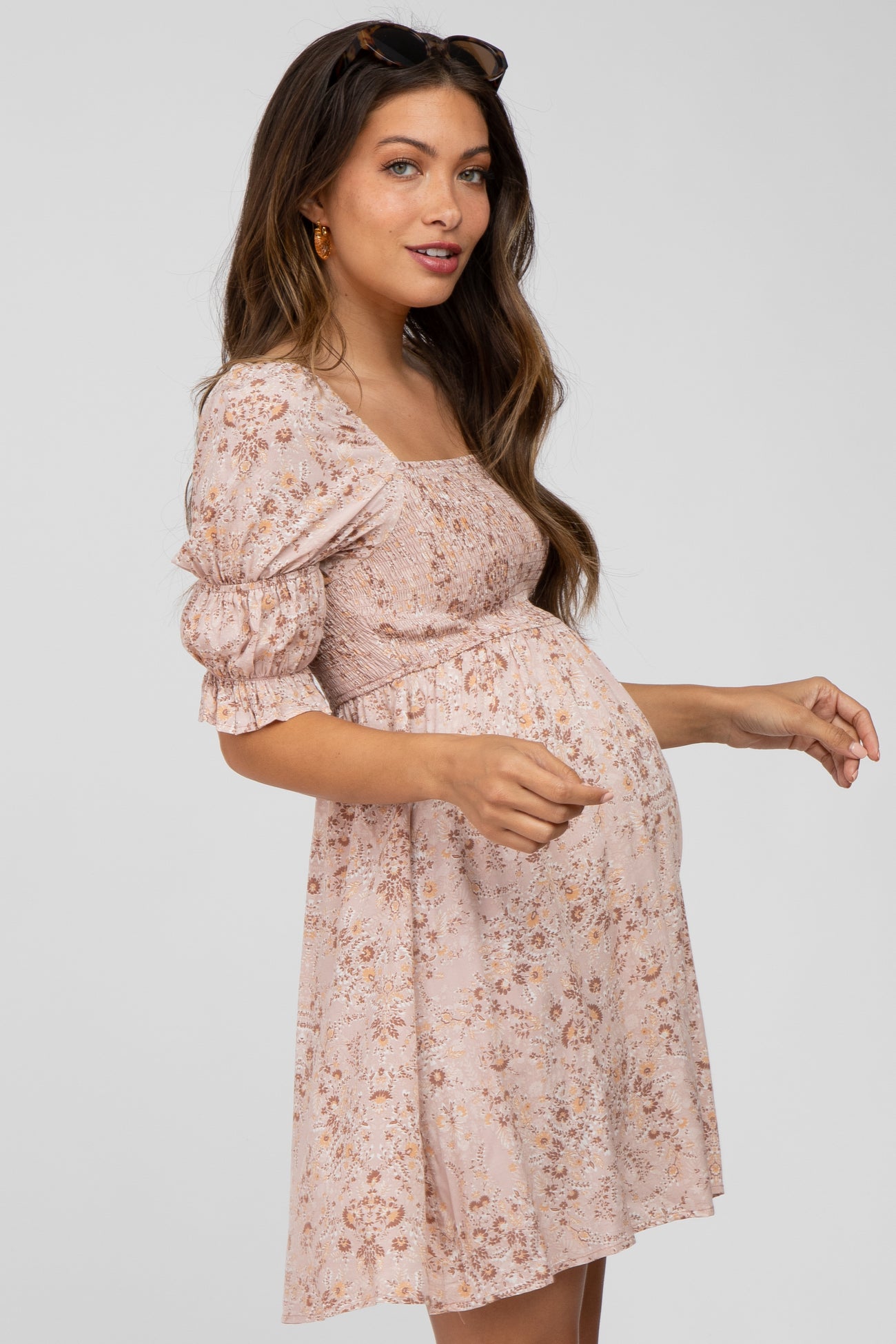 Pink Floral Smocked Square Neck Puff Sleeve Maternity Dress