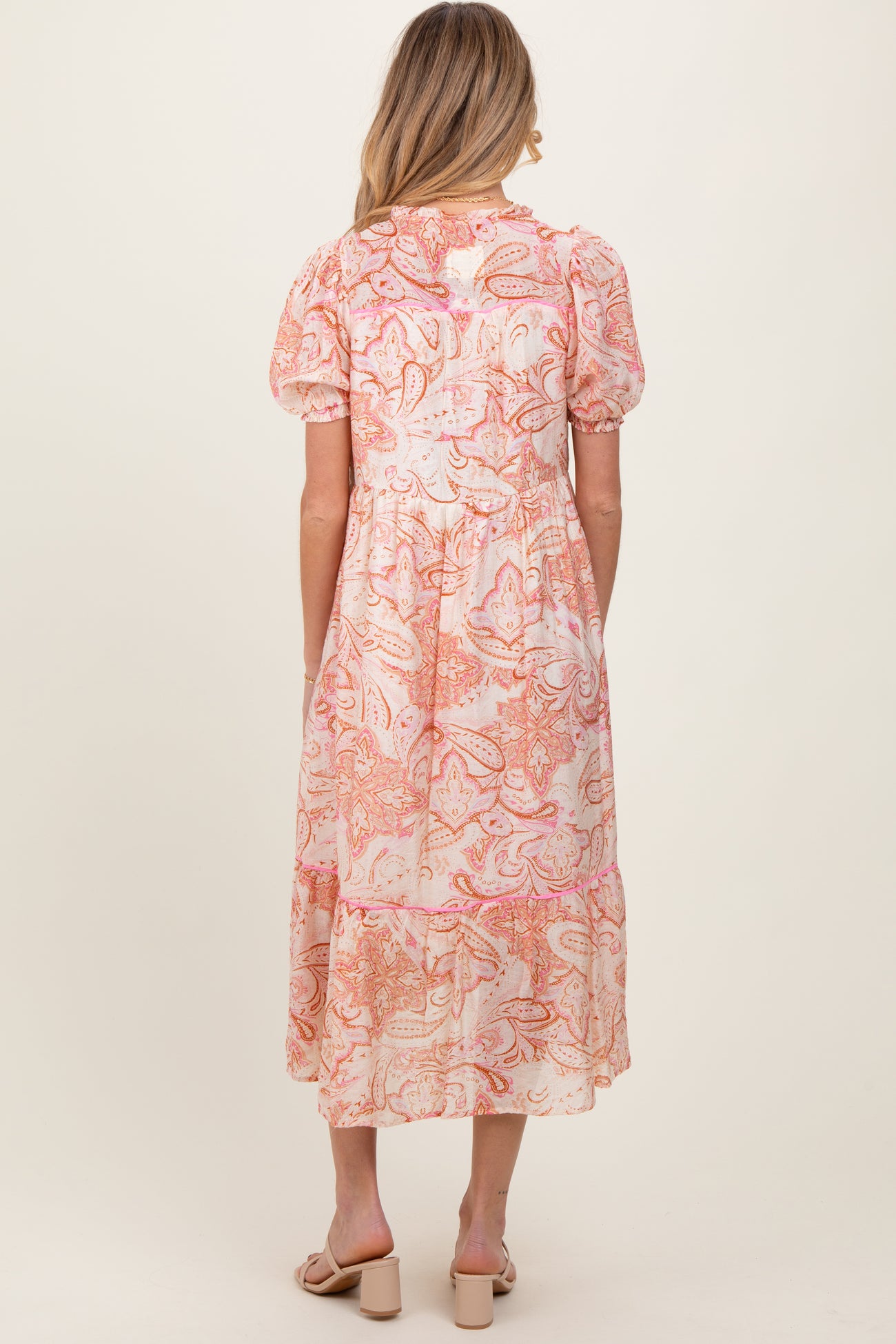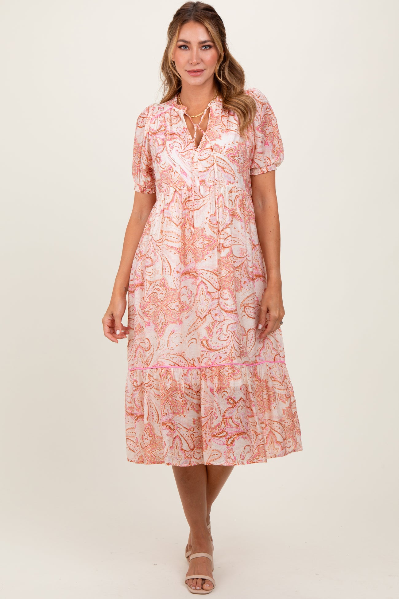 Pink Paisley Front Tie Ruffle Trim Maternity Midi Dress
