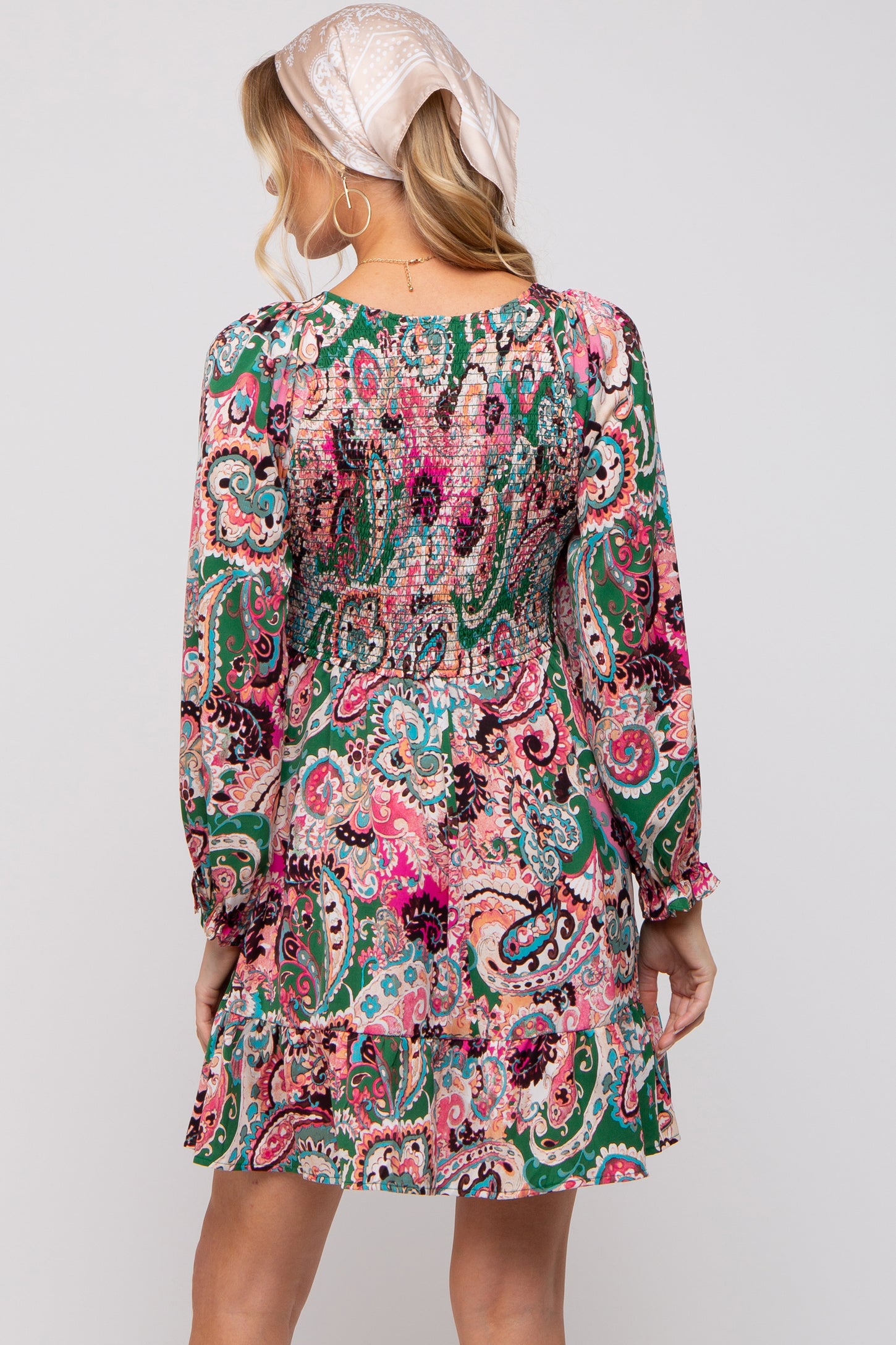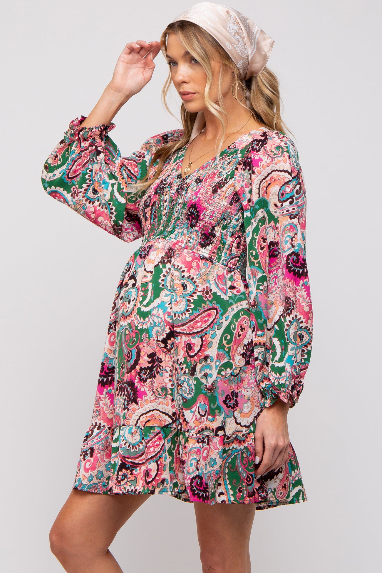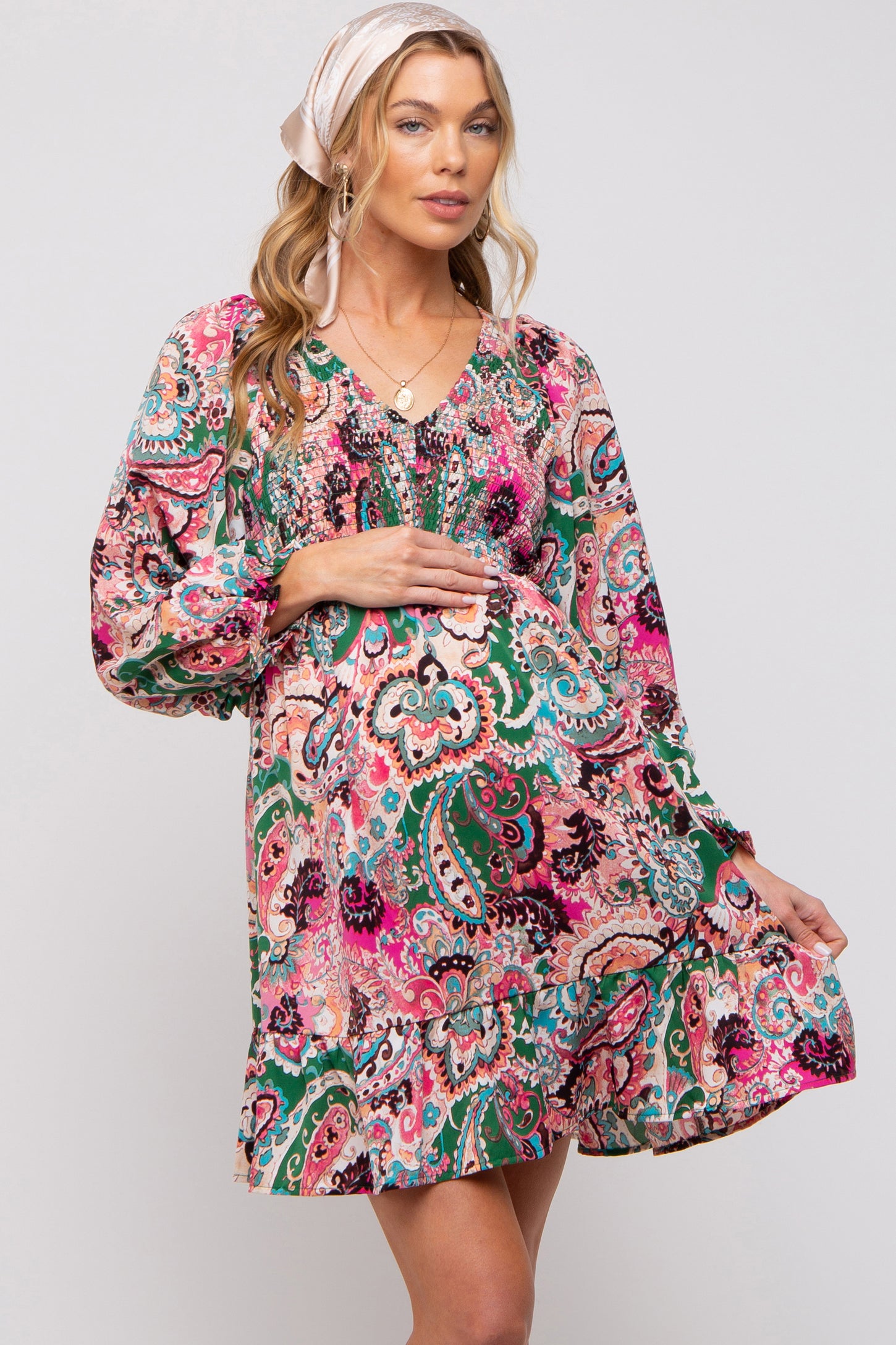 Pink Paisley Smocked Long Sleeve Maternity Dress
