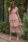 A pleated midi dress with a v-neckline, tiered cap sleeves, a back tie, and a tiered skirt. Skirt is lined.