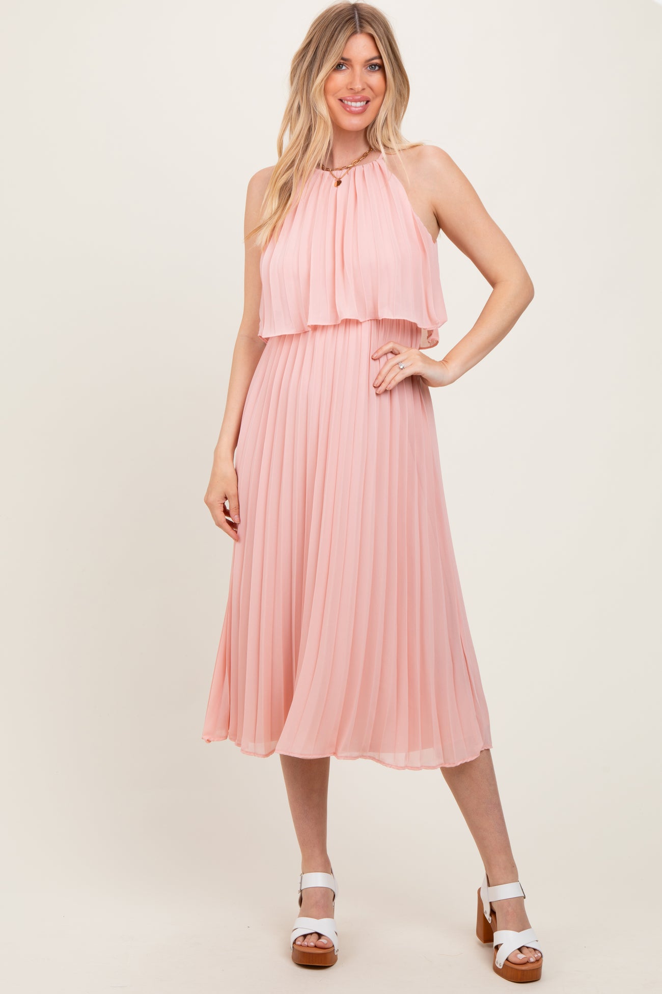 Pink Pleated Woven Maternity Midi Dress