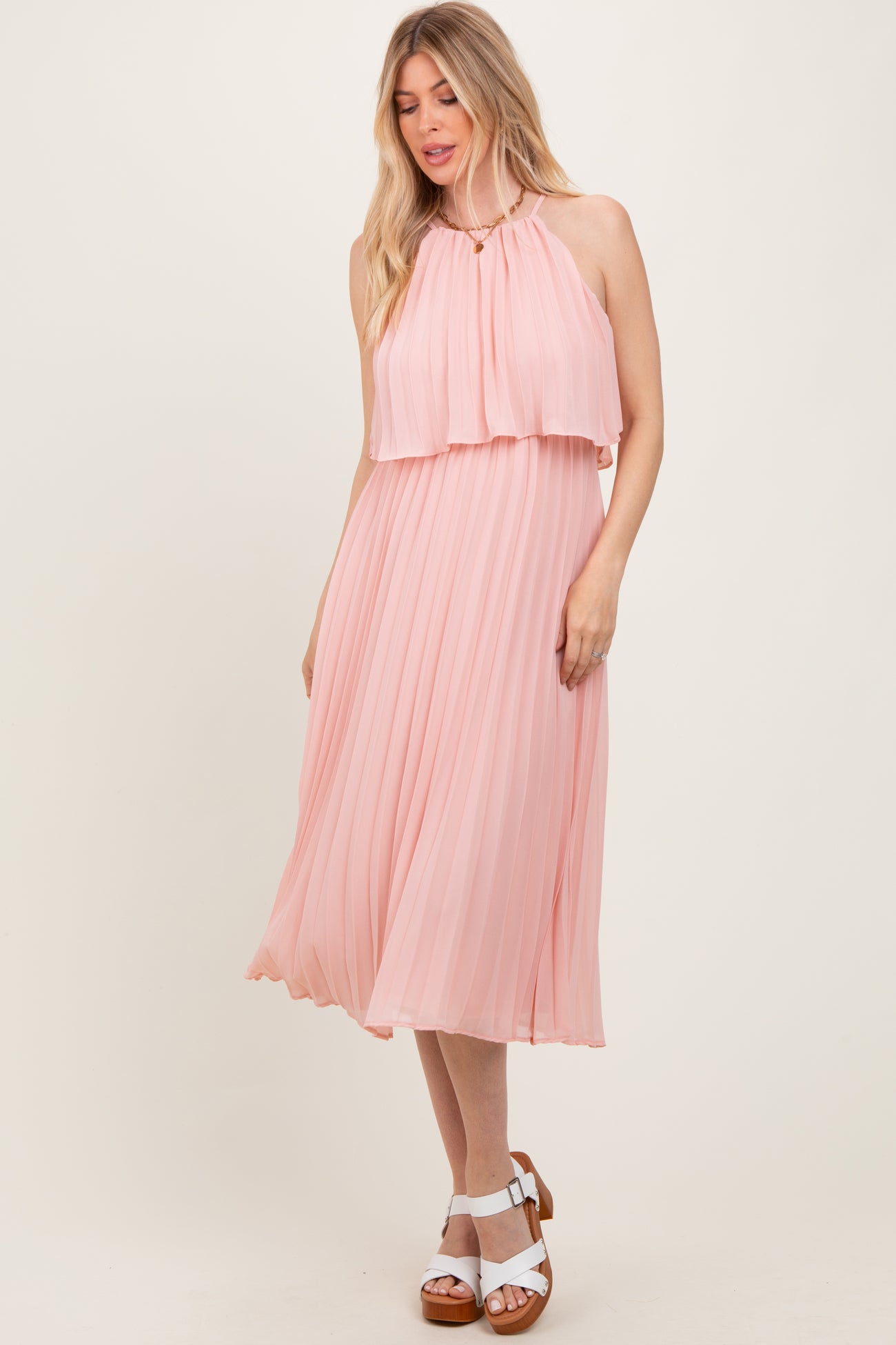 Step into effortless elegance with our Pink Pleated Woven Midi Dress. This stunning dress features a delicate pleated design that flows gracefully from the halter neckline to the midi-length hem. Crafted from lightweight woven fabric, it offers a soft, breathable feel perfect for warm days or special occasions. The flattering layered bodice adds dimension, while the cinched waist accentuates your silhouette beautifully. Pair with sandals or heels for a chic daytime look or evening affair. Whether you're attending a wedding, brunch, or garden party, this versatile dress combines comfort and style with ease. Available in soft pink for a feminine touch.