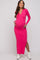 A rib knit maternity maxi dress featuring a v-neckline, a collar, long sleeves, and a side slit.