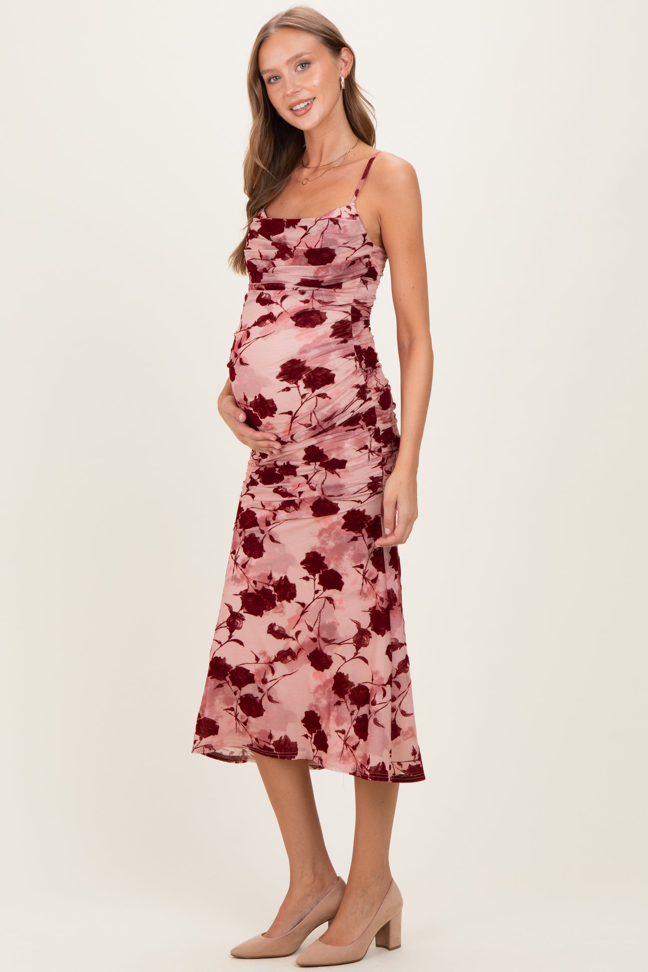 Pink Rose Floral Mesh Ruched Maternity Midi Dress