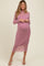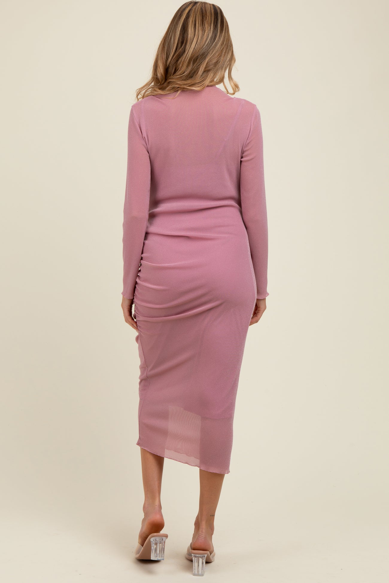 Pink Shimmer Mesh Long Sleeve Ruched Maternity Midi Dress