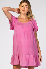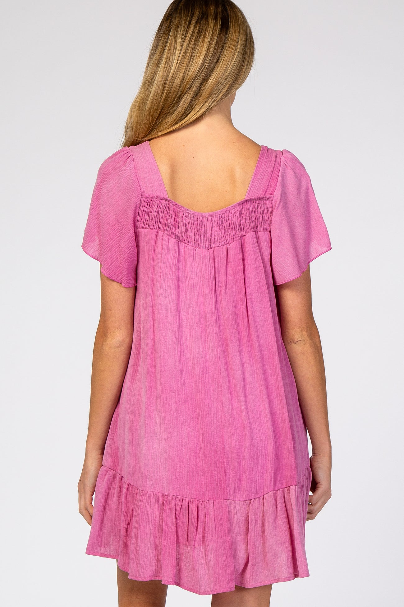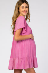 A solid hued maternity dress featuring a smocked square neckline, short flutter sleeves, and a ruffle trim hemline.