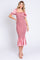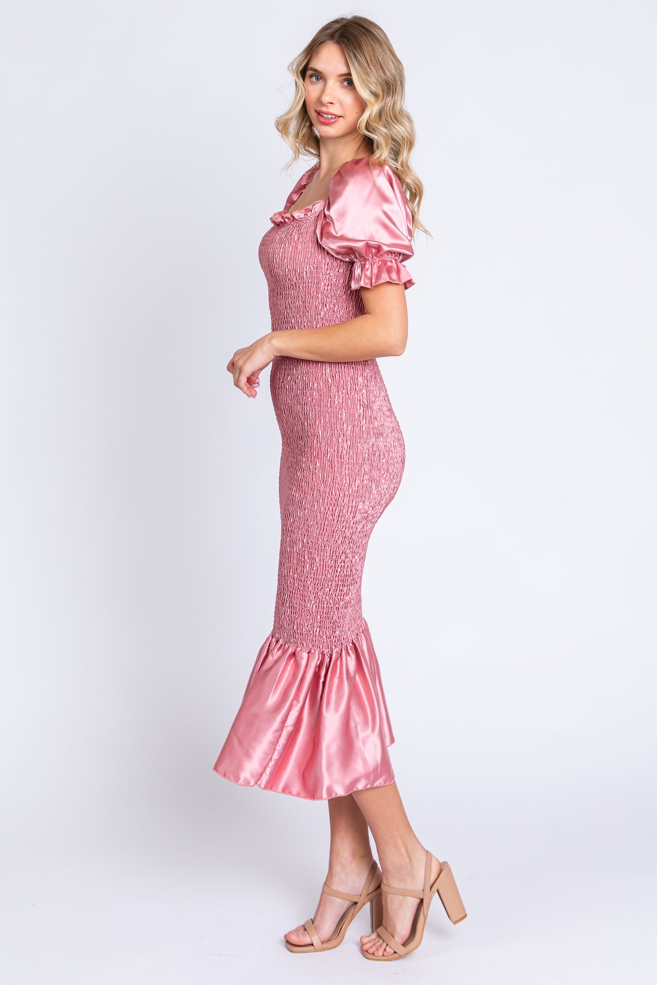 A satin smocked midi dress featuring a squared neckline, short puff sleeves, ruffles along the neckline, a smocked body, and a gathered bottom tier.