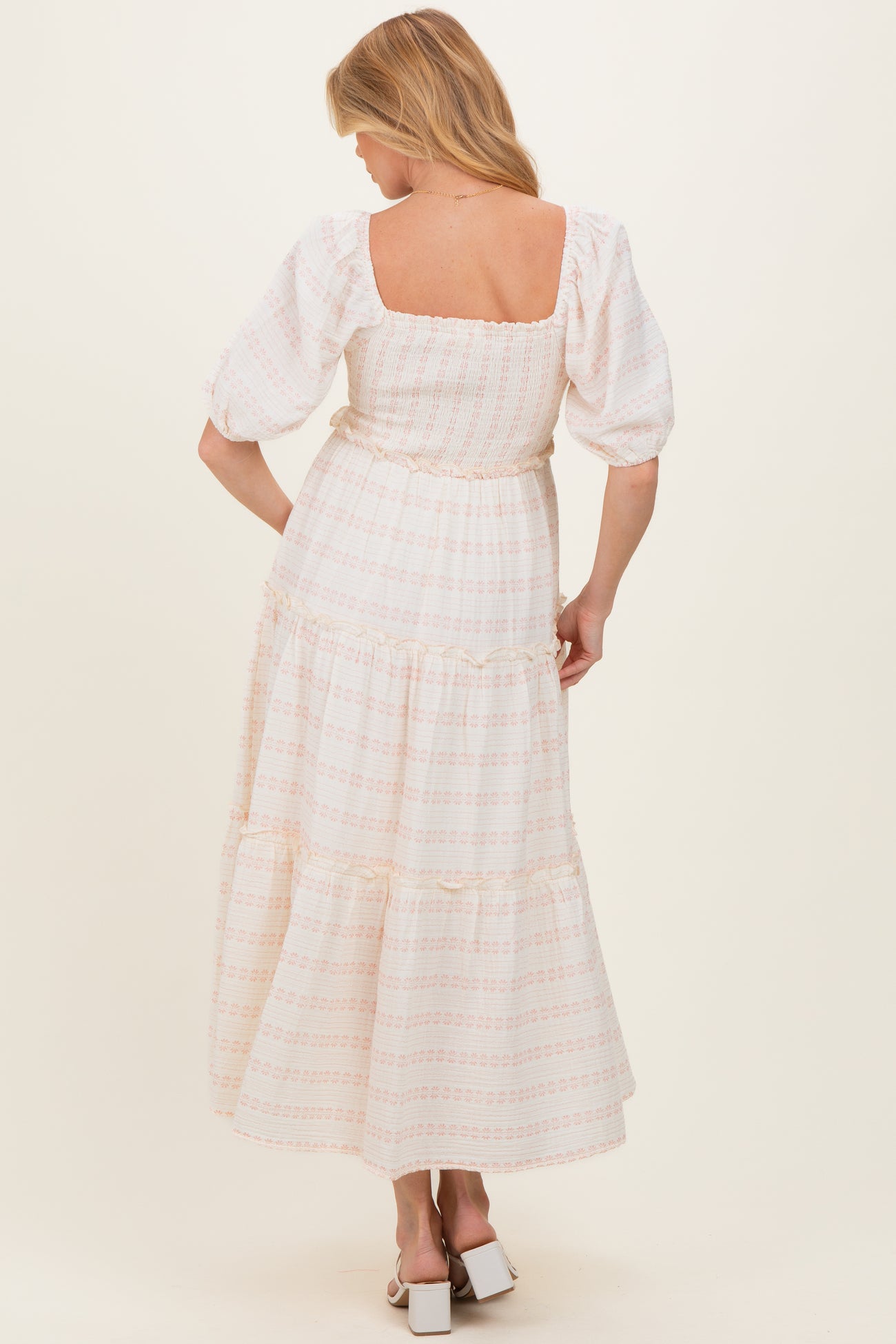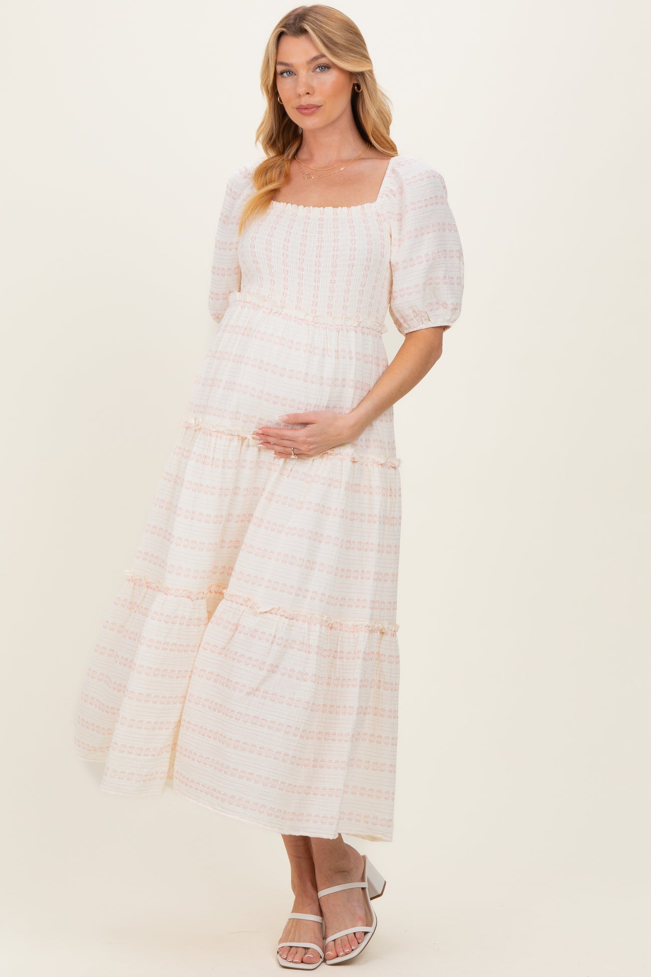 Elevate your maternity wardrobe with this soft floral smocked maxi dress, designed for comfort and style throughout your pregnancy. Featuring a flattering square neckline and puff sleeves, this dress offers a delicate, feminine touch. The smocked bodice provides gentle stretch to accommodate your growing bump, while the tiered skirt flows gracefully for effortless movement. Made from lightweight, breathable fabric, it’s perfect for all-day wear, whether you’re attending a baby shower or enjoying a casual day out. Pair with sandals or heels for a chic, versatile look that celebrates your beautiful journey.