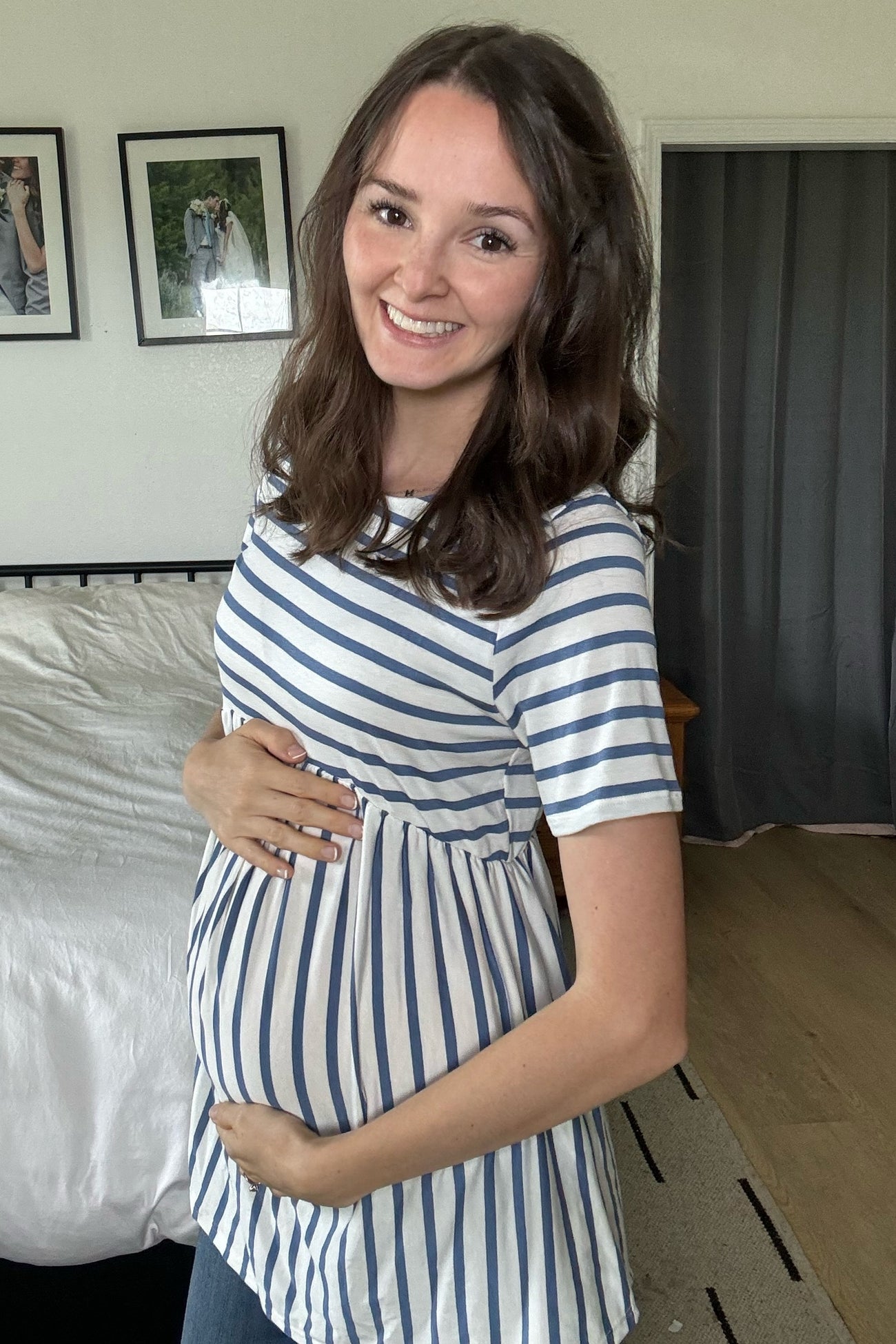 A striped peplum maternity top featuring a low back with a cross accent, short sleeves, and a rounded neckline.