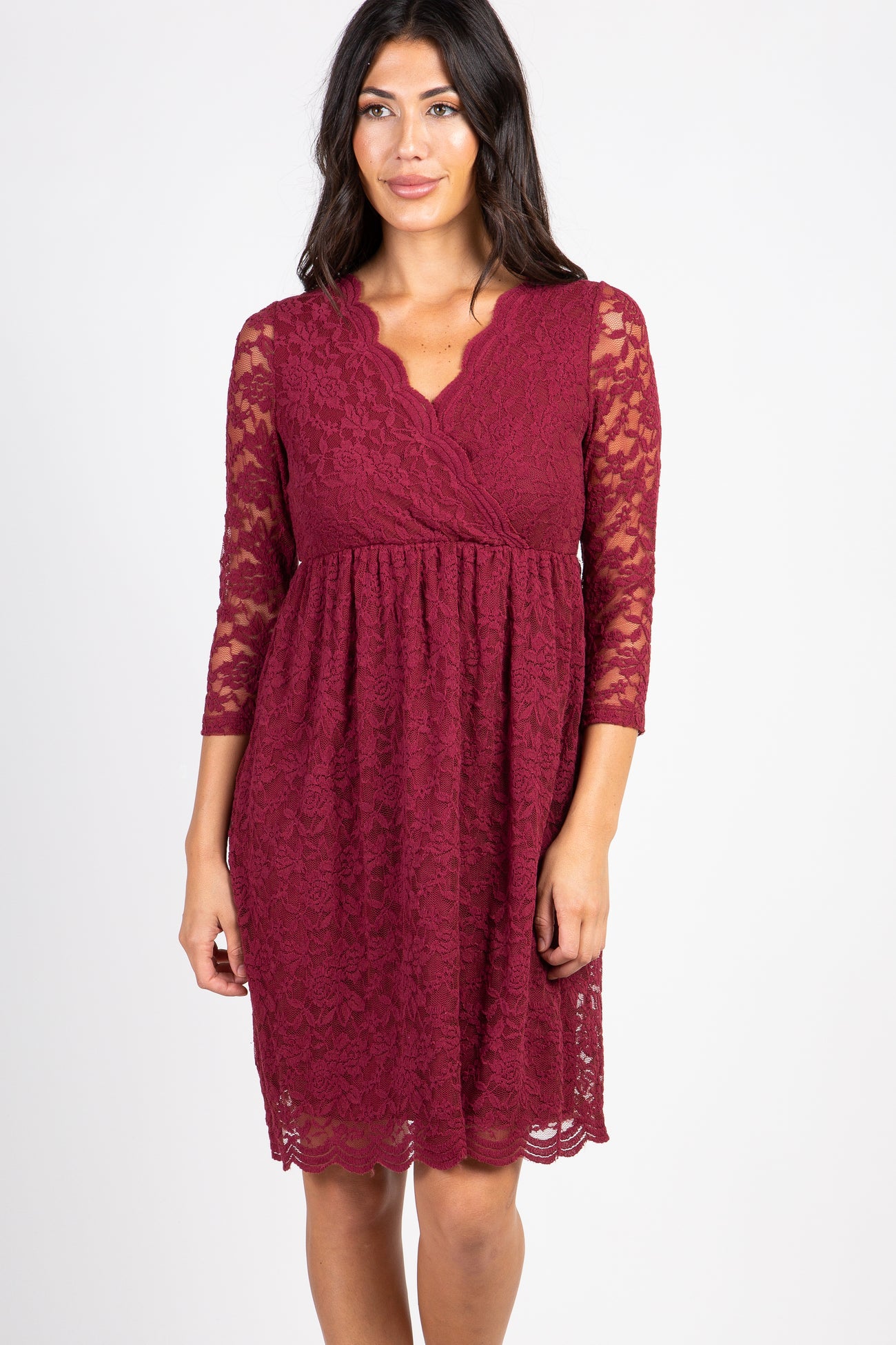 A lace overlay dress featuring semi-sheer 3/4 sleeves, double lining to prevent sheerness, a scalloped lace trim, elastic cinching under the bust, and a wrap v-neckline.