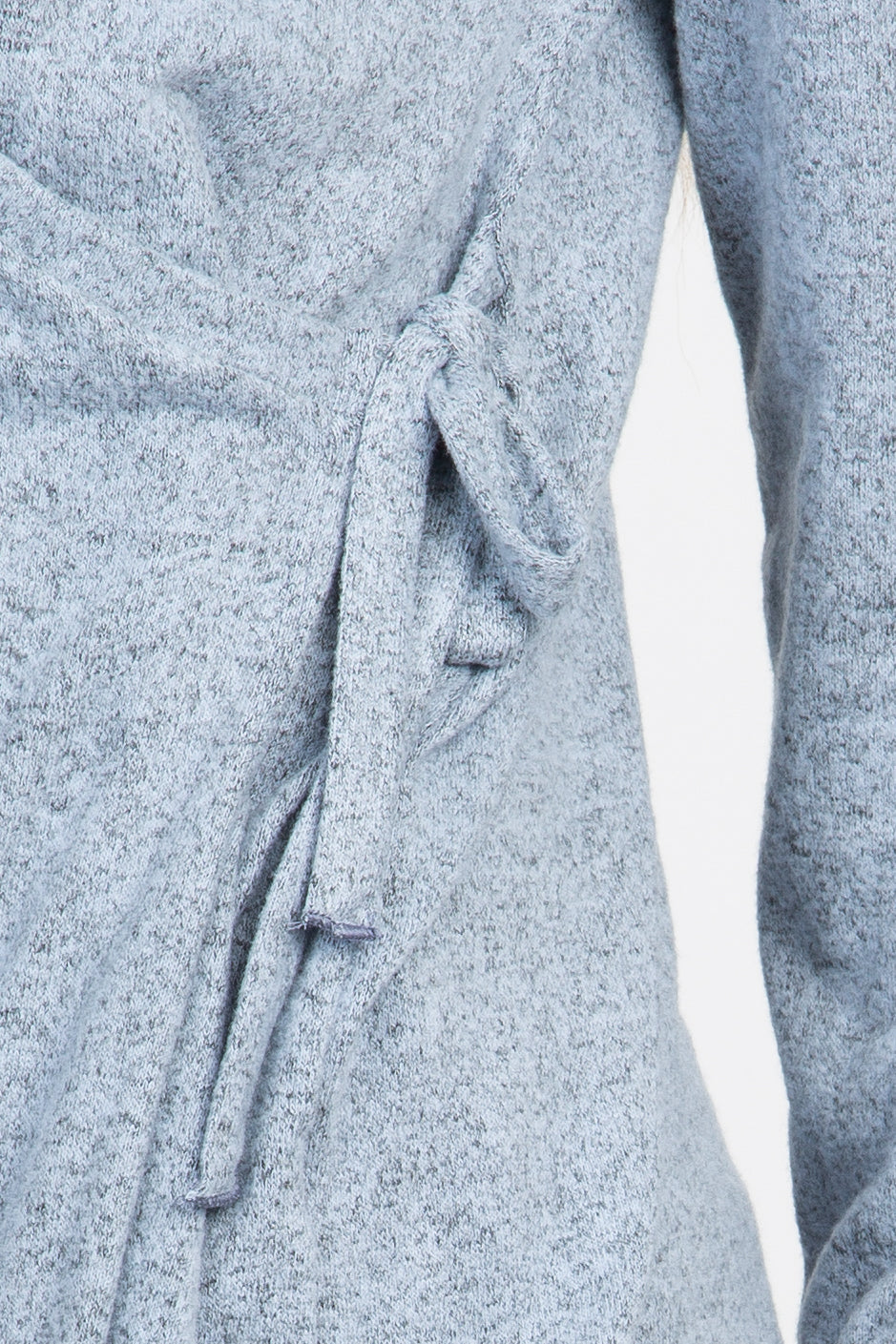 A soft knit, heathered top featuring a wrap front with a side tie closure, a v-neckline, and long sleeves.