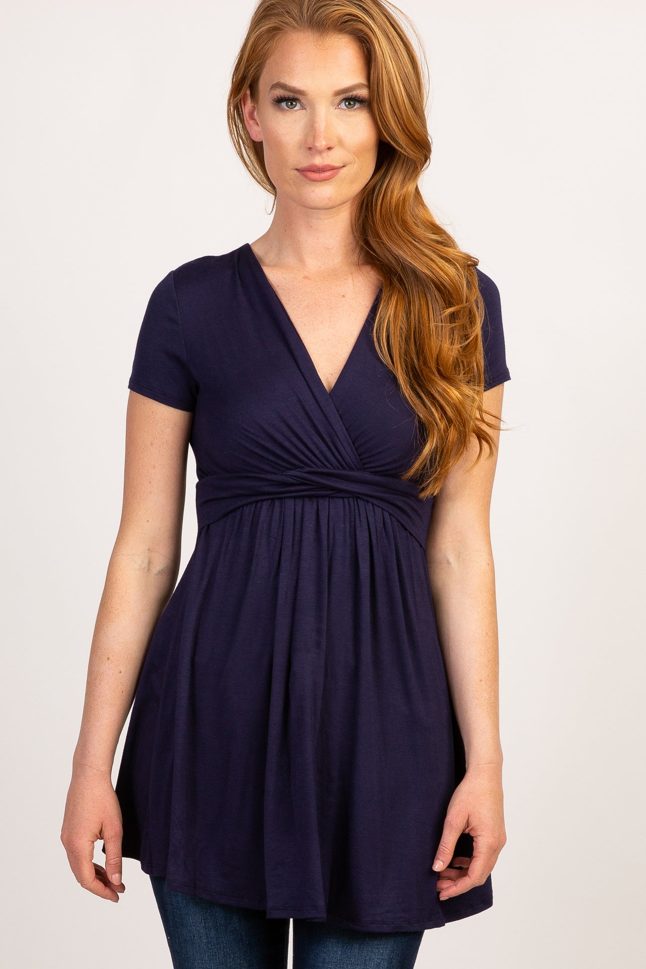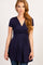 A draped front top featuring a v-neckline, short sleeves, and cinching under bust.