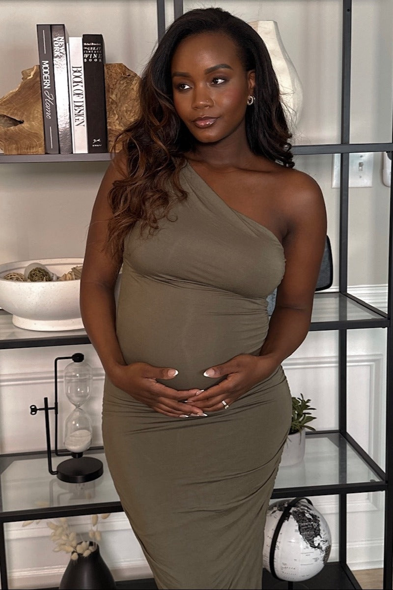 PinkBlush Olive Ruched One Shoulder Maternity Dress