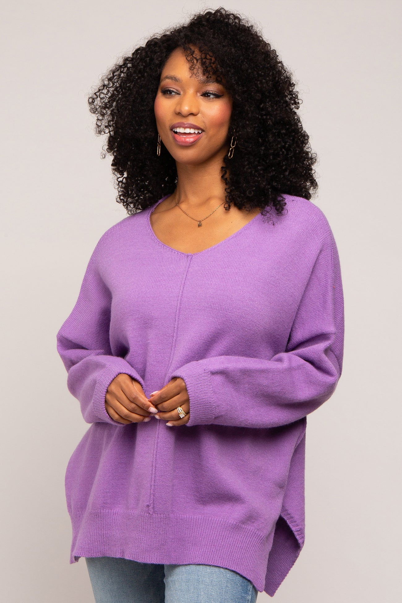 A solid long sleeve sweater with dolman sleeves and two small side slits.