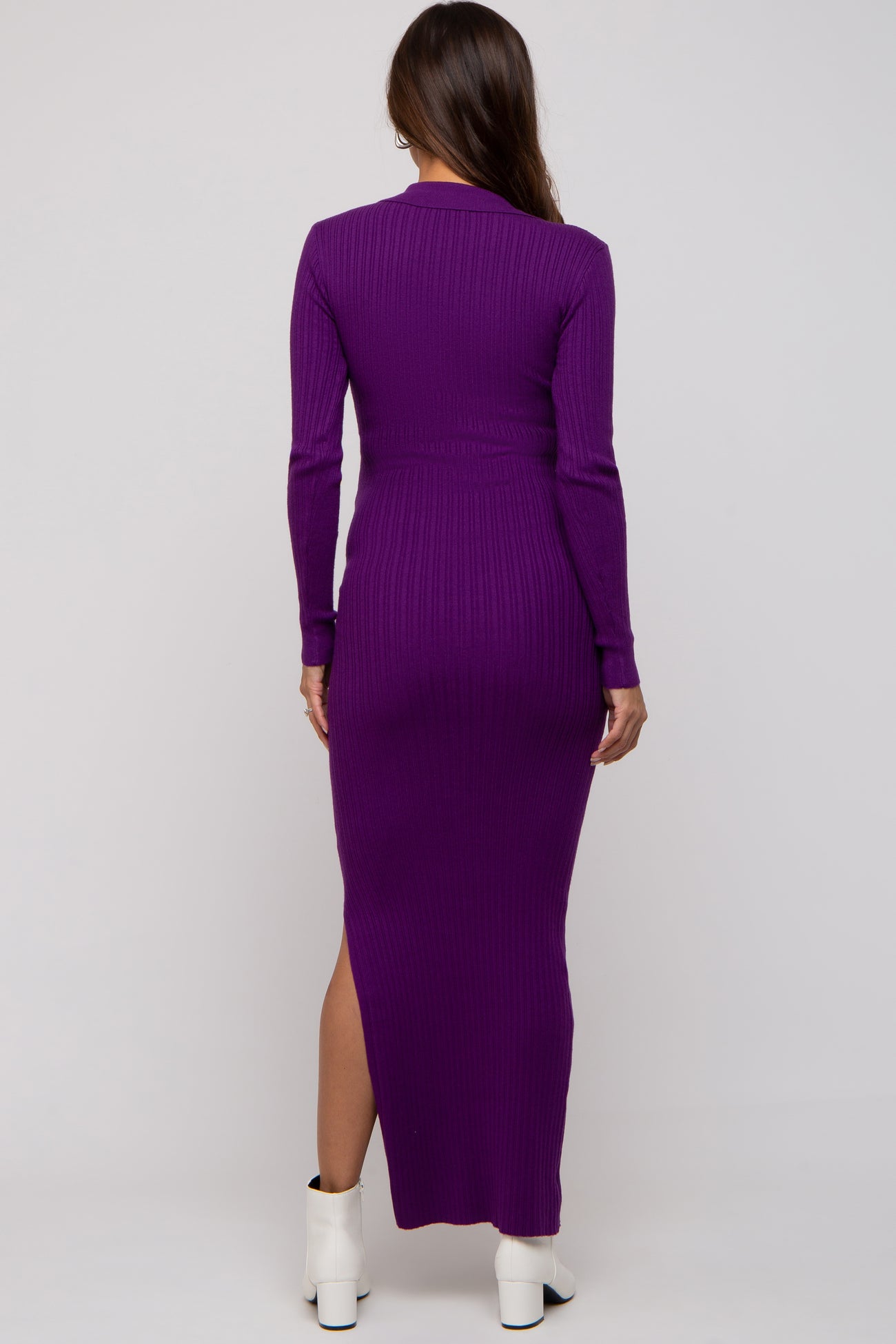 A rib knit maternity maxi dress featuring a v-neckline, a collar, long sleeves, and a side slit.