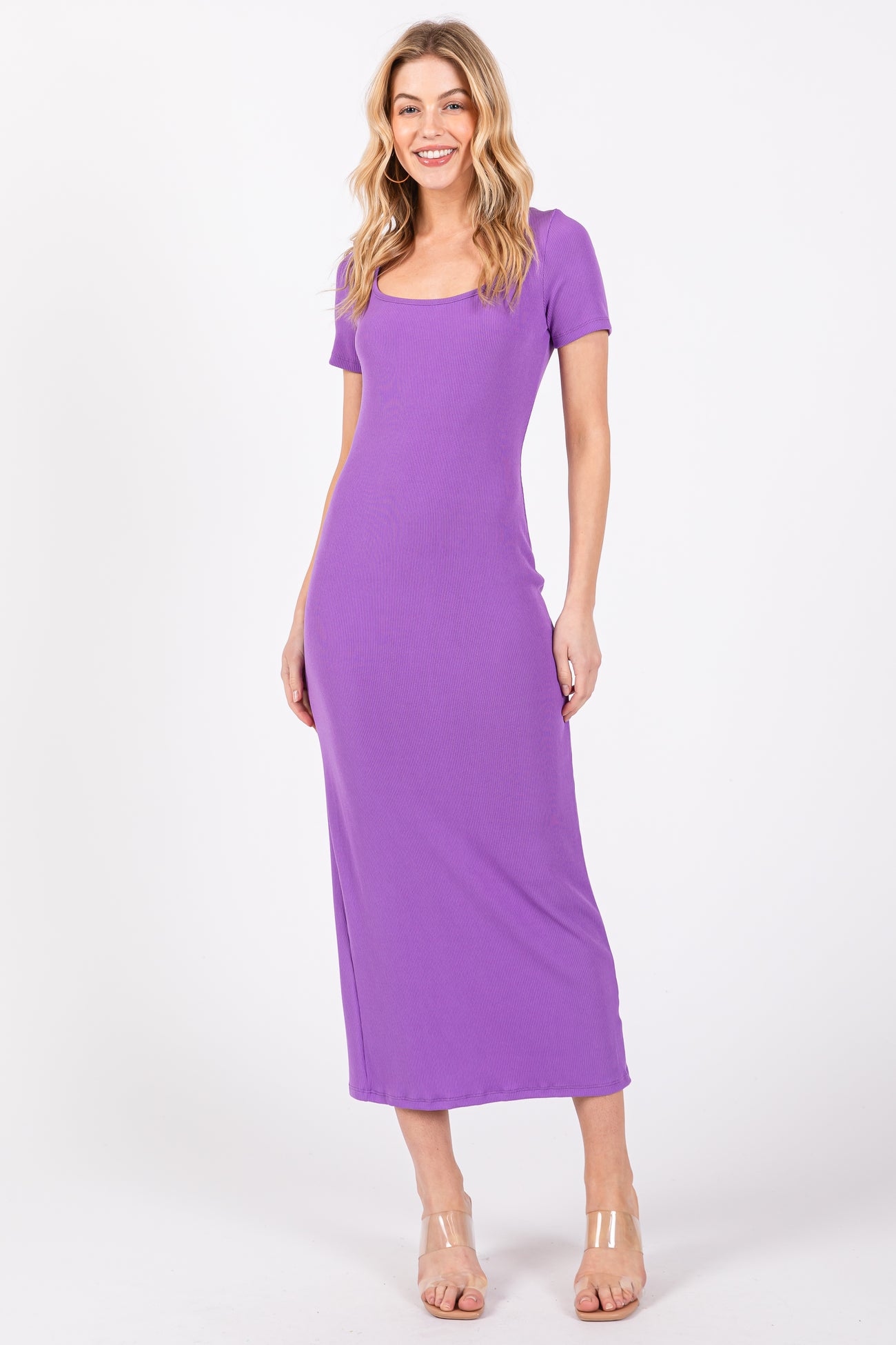 A solid ribbed fitted maternity midi dress with short sleeves, a square neckline, and back slit.