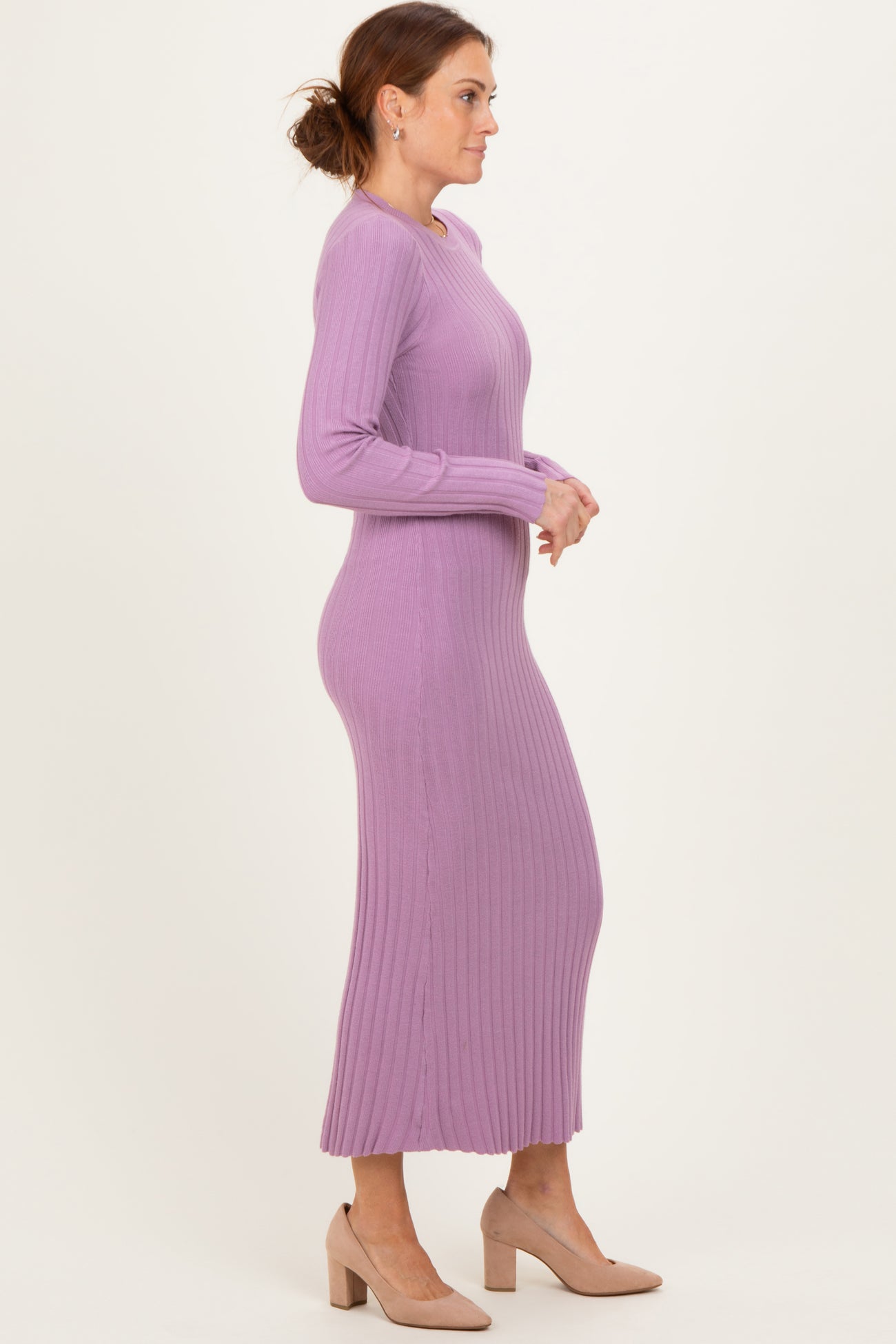 Purple Ribbed Knit Fitted Midi Sweater Dress