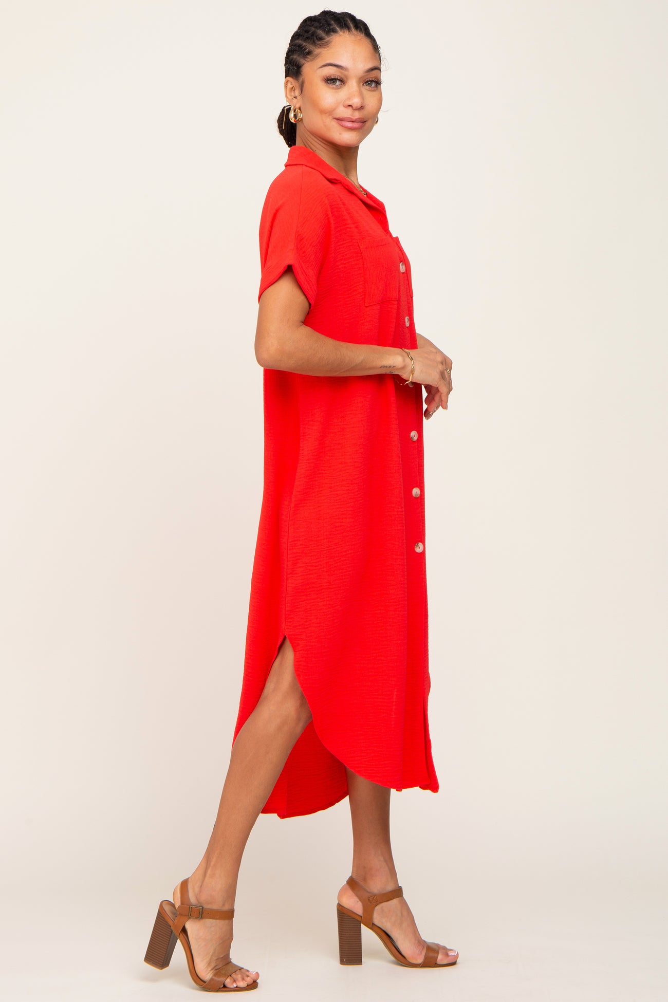 A solid maxi dress featuring functioning front buttons, a collar, two front pockets, cuffed short dolman sleeves, and a hi-low rounded hemline.