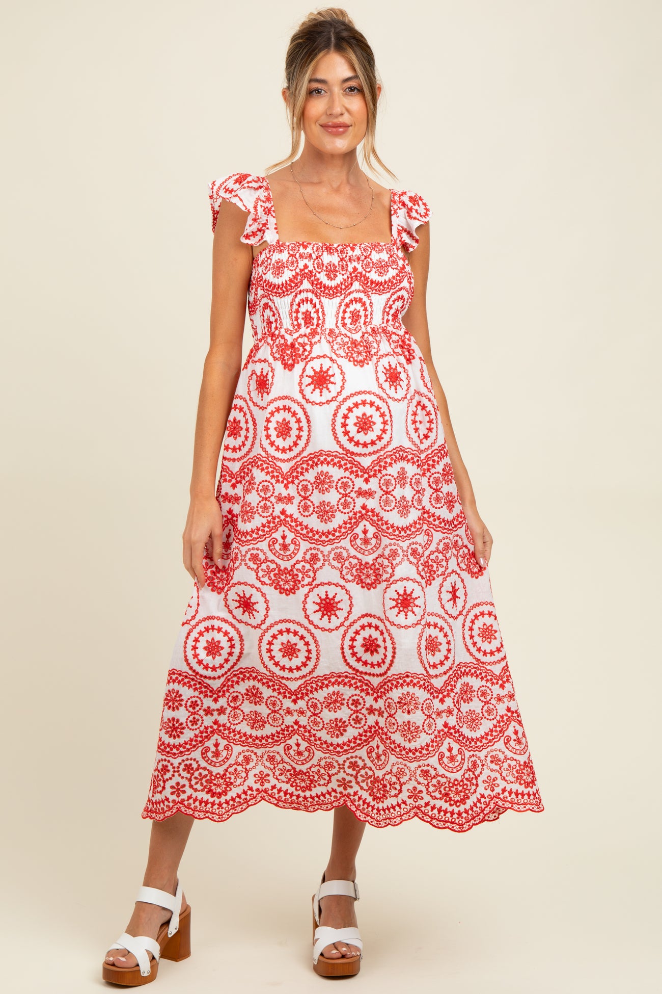 Embrace effortless style and comfort in this Red Embroidered Smocked Cutout Maternity Midi Dress. Featuring intricate red embroidery on a white base, this dress adds a touch of boho-chic elegance to your maternity wardrobe. The smocked bodice provides gentle stretch and support, perfectly accommodating your growing bump. Delicate ruffled straps and a flattering midi length with scalloped hem create a feminine silhouette that’s ideal for any occasion. Lightweight and breathable, this dress keeps you cool and comfortable from day to night. Elevate your maternity look with this standout piece designed for both style and ease.