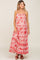 A floral printed maternity maxi dress featuring a square neckline, adjustable cami straps, an adjustable tie at the waist a tiered hem and double lining.