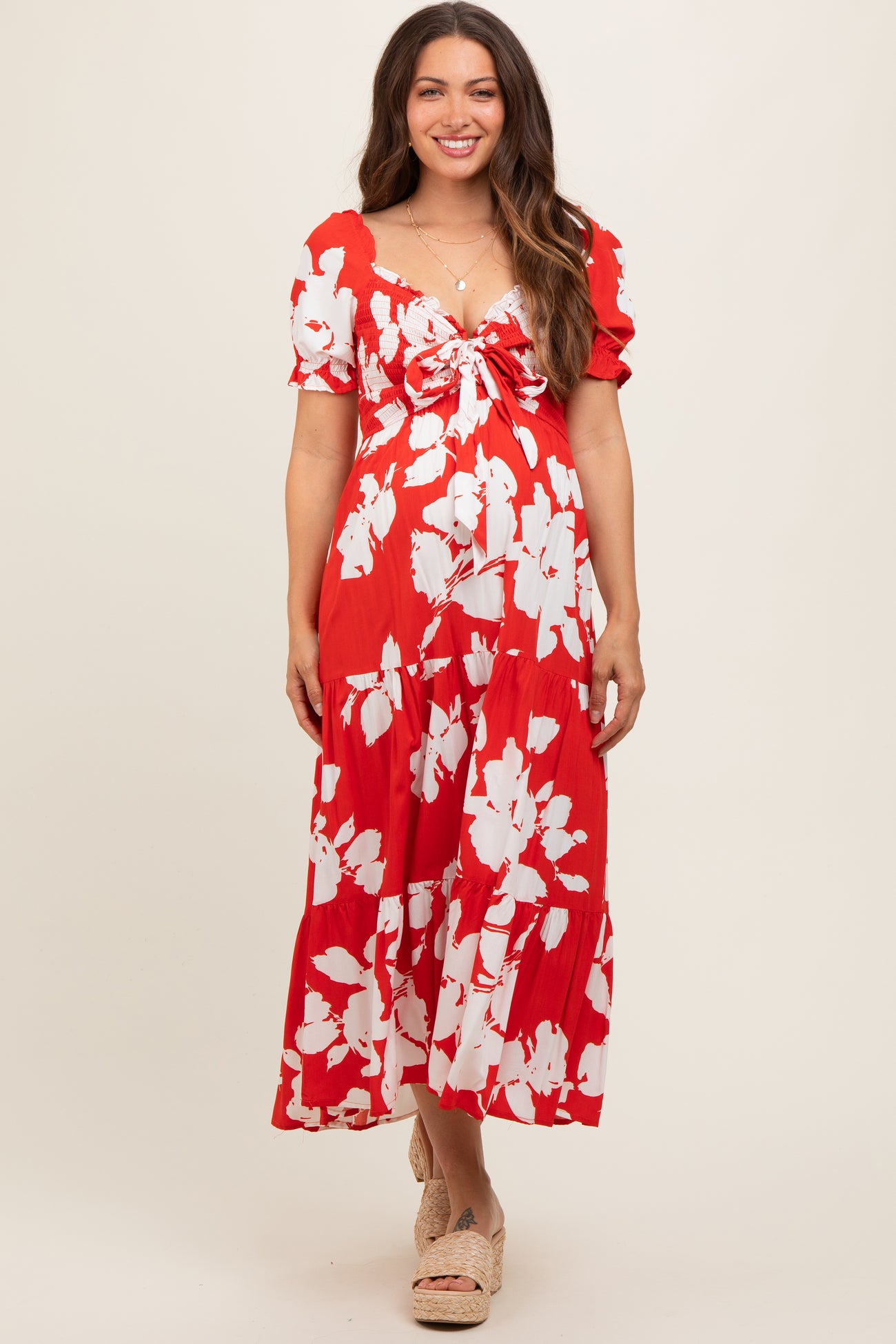 Red Floral Smocked Knotted Top Maternity Maxi Dress