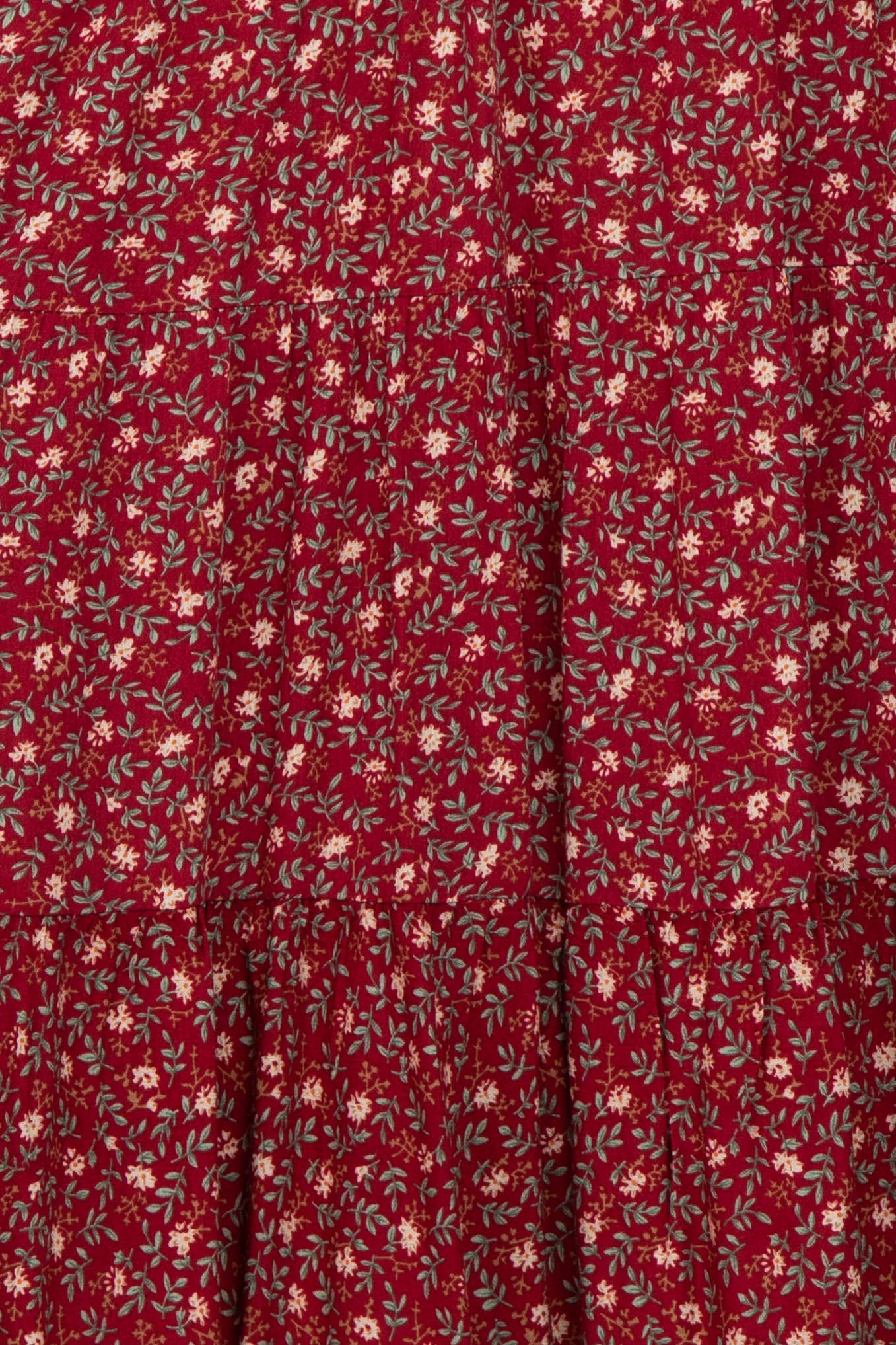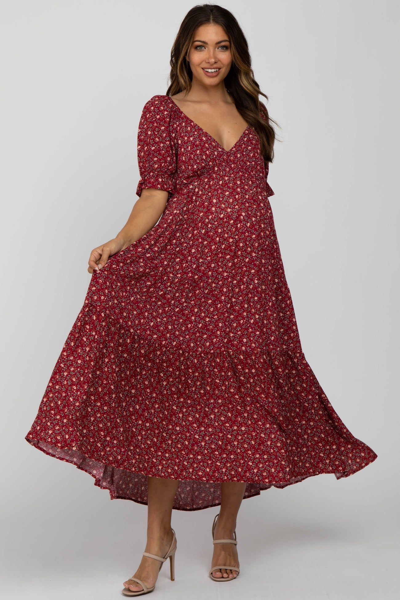 A floral print maternity midi dress featuring a v-neckline, short bubble sleeves with ruffle trim, an empire waist with an elastic band, pleated tiers and a ruffle hem.