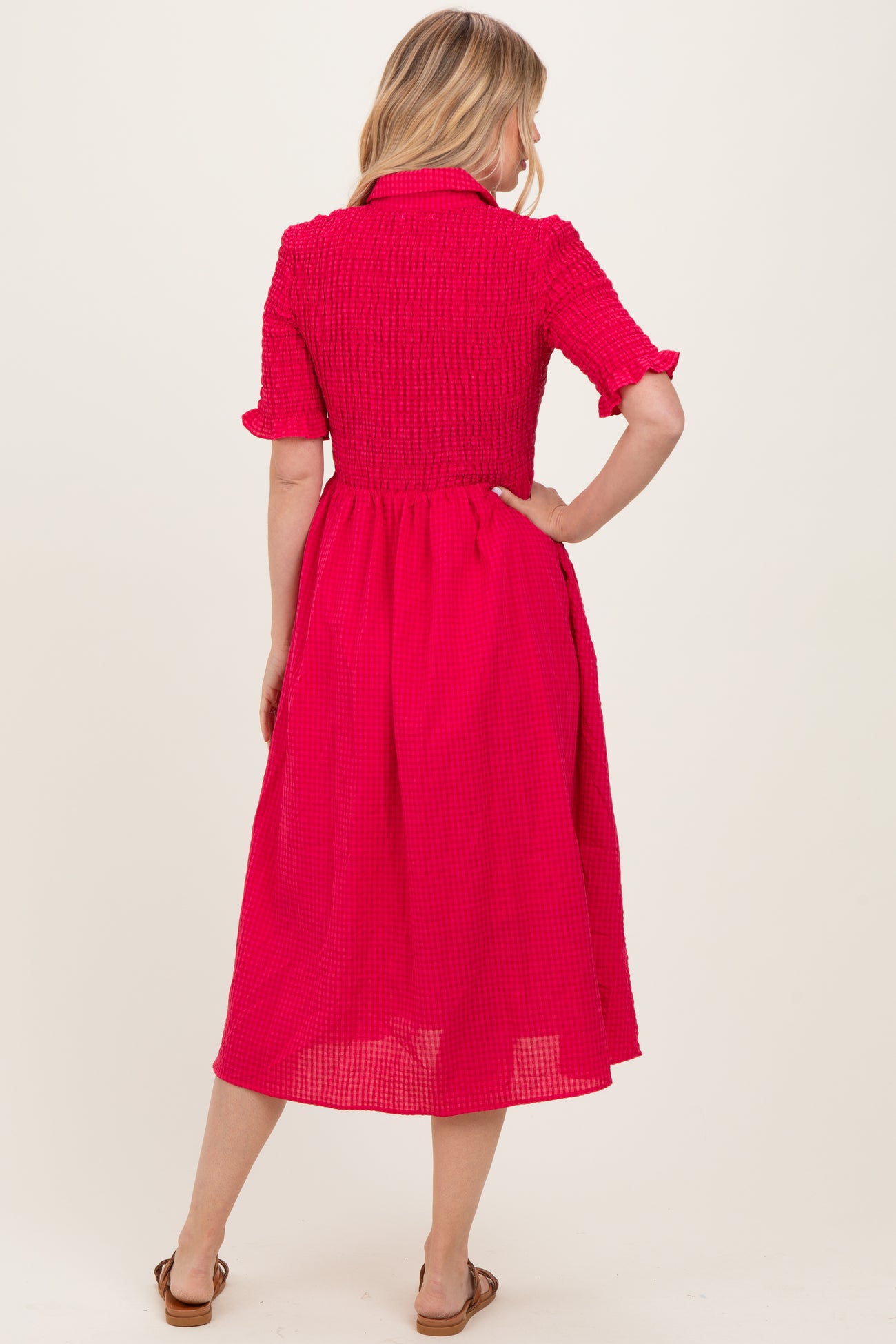 Elevate your wardrobe with this charming gingham smocked midi dress. Featuring a flattering smocked bodice that cinches the waist, it effortlessly enhances your silhouette. The button-down front adds a stylish touch, while the midi length offers perfect coverage for various occasions. Designed with short sleeves that have delicate ruffle hems, this dress combines comfort and feminine detail. Made from lightweight, breathable fabric, it’s ideal for warm weather days or layering into cooler seasons. Pair it with sandals or sneakers for an easy, chic look you'll reach for again and again.