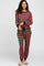 A printed pajama set. Features long sleeve top and drawstring elastic waistband pants. Pants are pocketed.