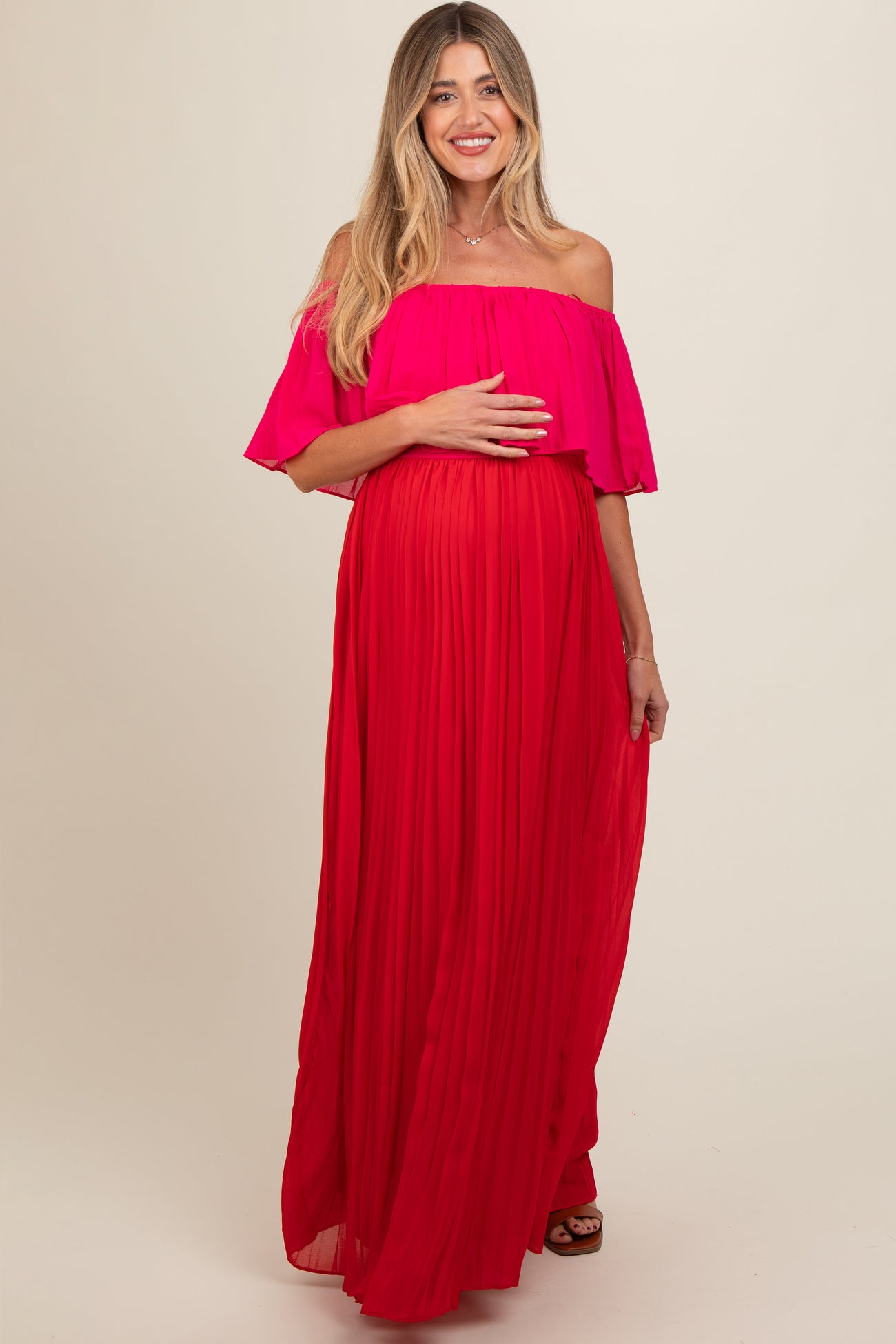 Red Pleated Off Shoulder Colorblock Maternity Maxi Dress
