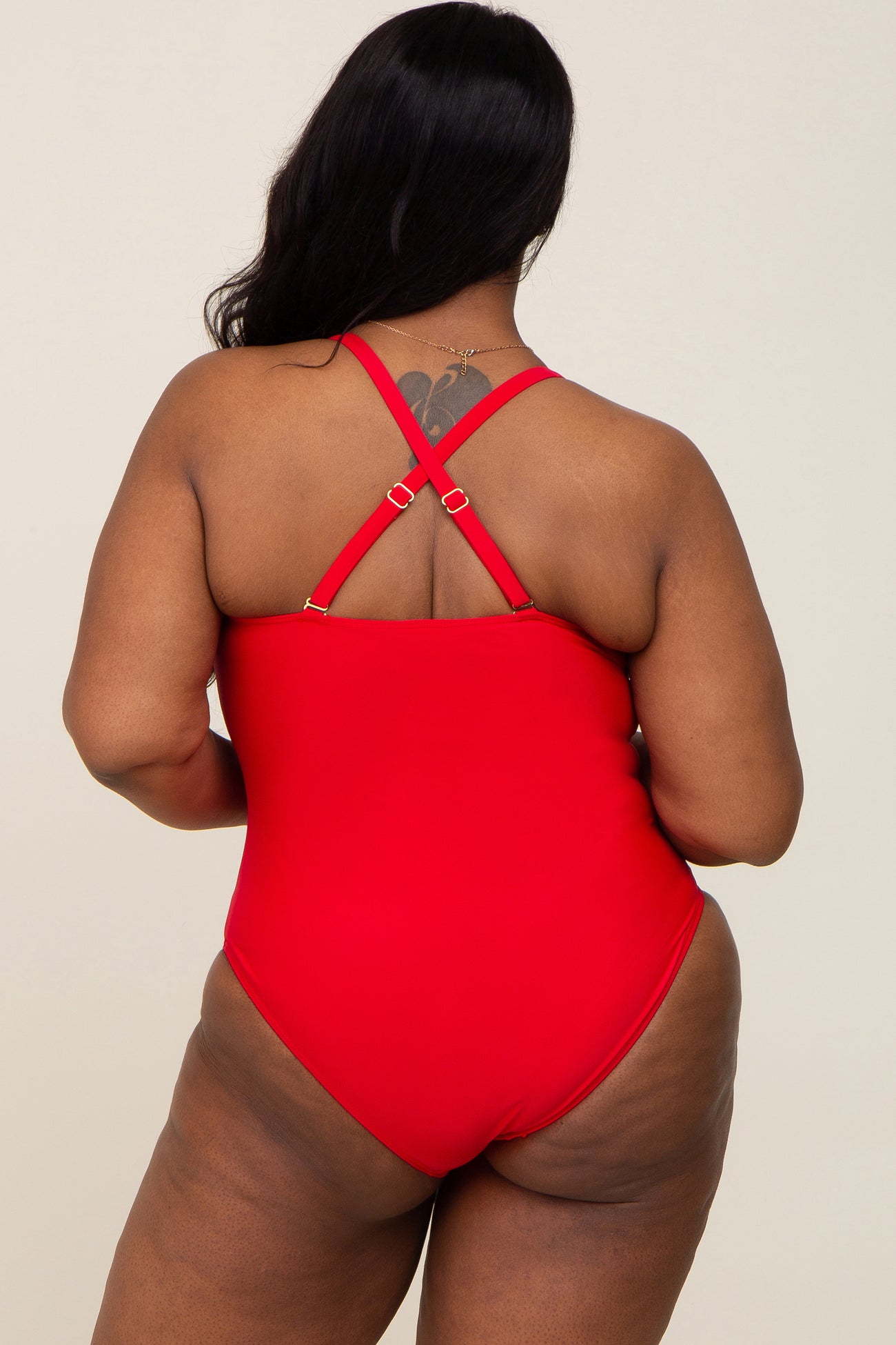 A plus one piece swimsuit featuring a ruched body, a padded bust and adjustable straps.