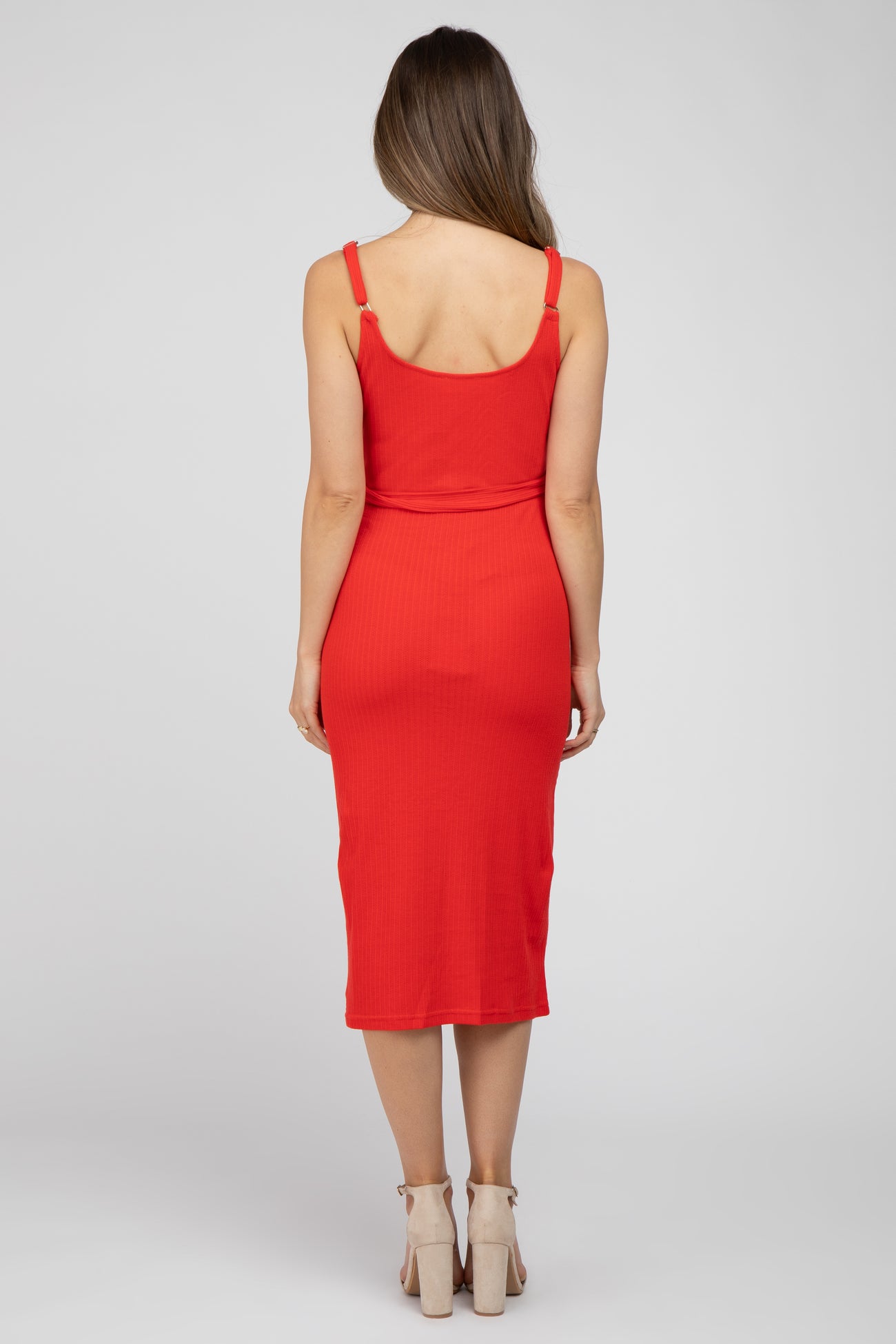 A solid sleeveless maternity midi dress featuring button decor in front, adjustable straps and a sash tie waist.