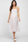 A striped maternity midi dress featuring a square neckline, smocked elastic top, adjustable cami straps, and a ruffle hem.