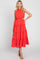 A solid midi with a rounded neckline, side cutouts, and a back zipper closure. Ruffles included along the neckline, cutout, and each tier.
