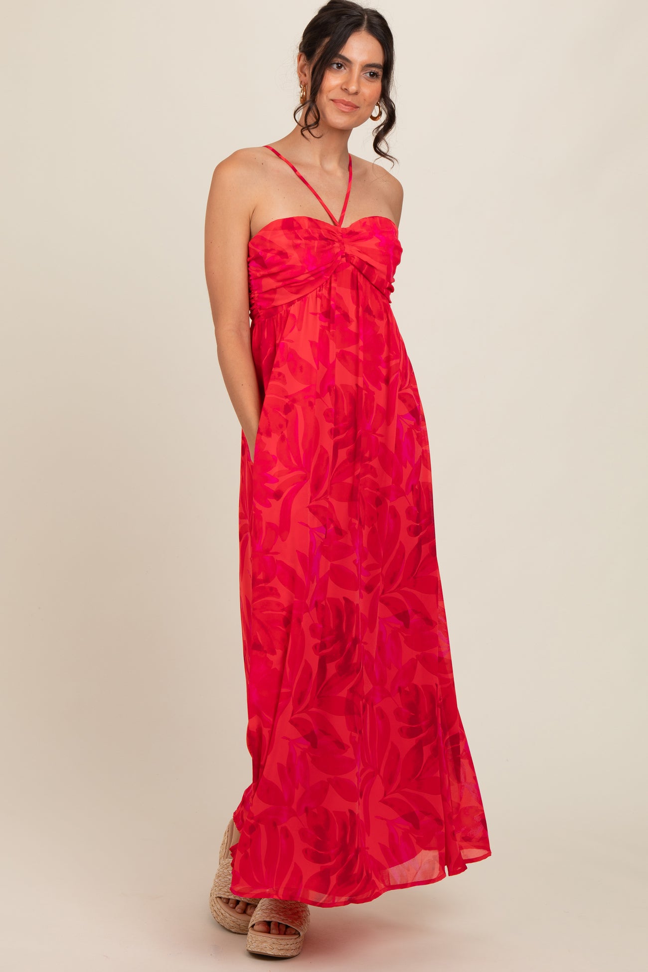 Red Tonal Floral Halter Maxi Dress