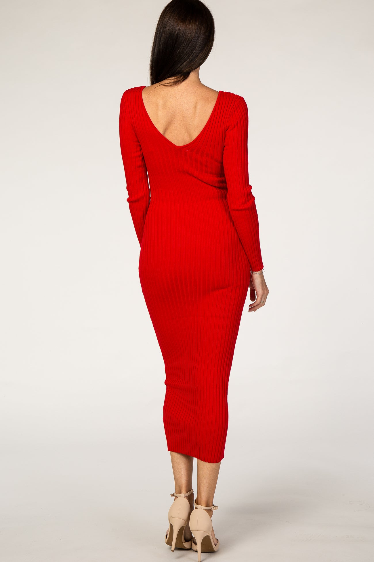 Red V-Neck Long Sleeve Fitted Maxi Dress