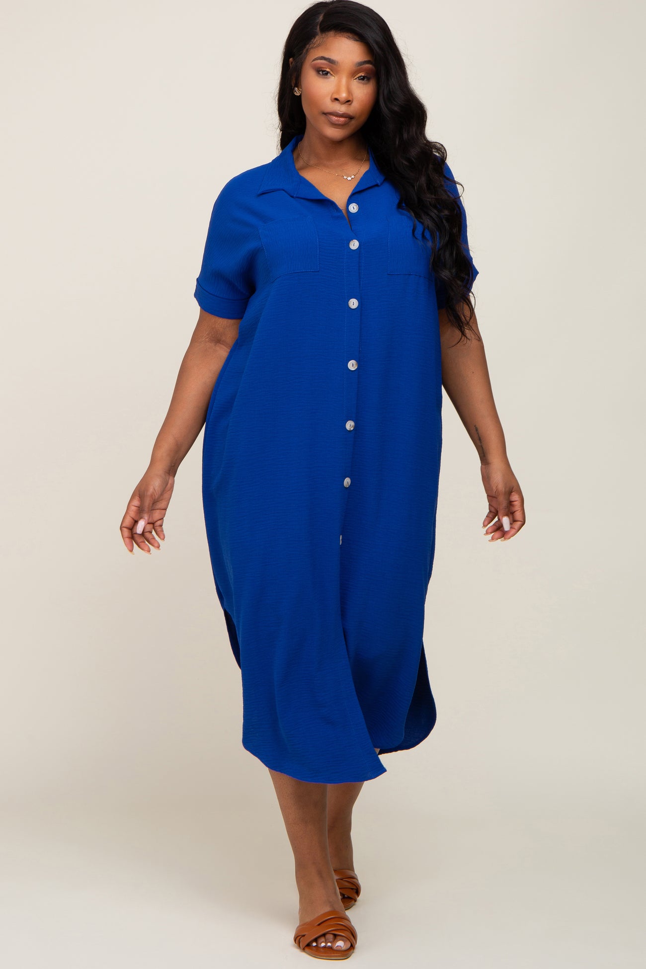 Royal Blue Button Down Hi Low Maternity Plus Maxi Dress